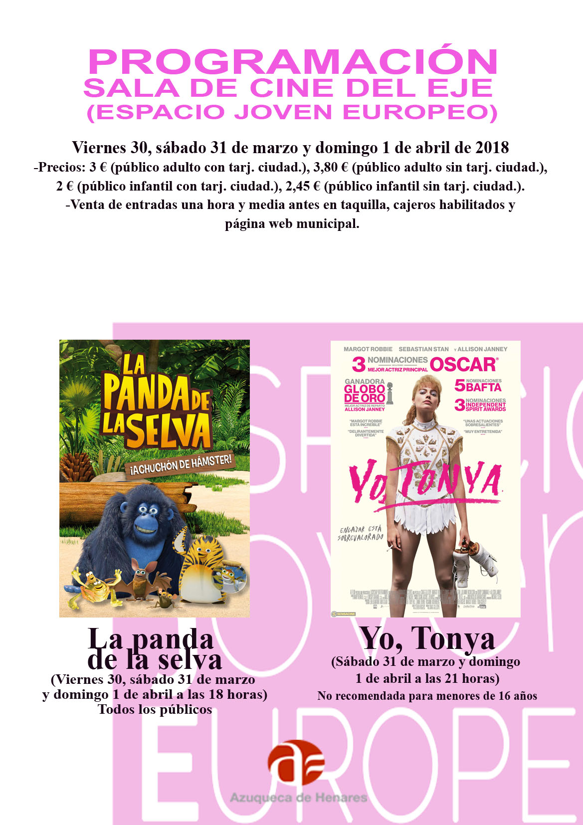 La programación semanal se puede consultar en la agenda de la web municipal www.azuqueca.es, así como en los perfiles del Ayuntamiento en las redes sociales del Ayuntamiento. Para este fin de semana, la oferta incluye la cinta familia 'La panda de la selva' (viernes, sabado y domingo, a las 18 horas) y 'Yo Tonya', no recomendada para menores de 16 años (el sábado y el domingo, a las 21 horas).