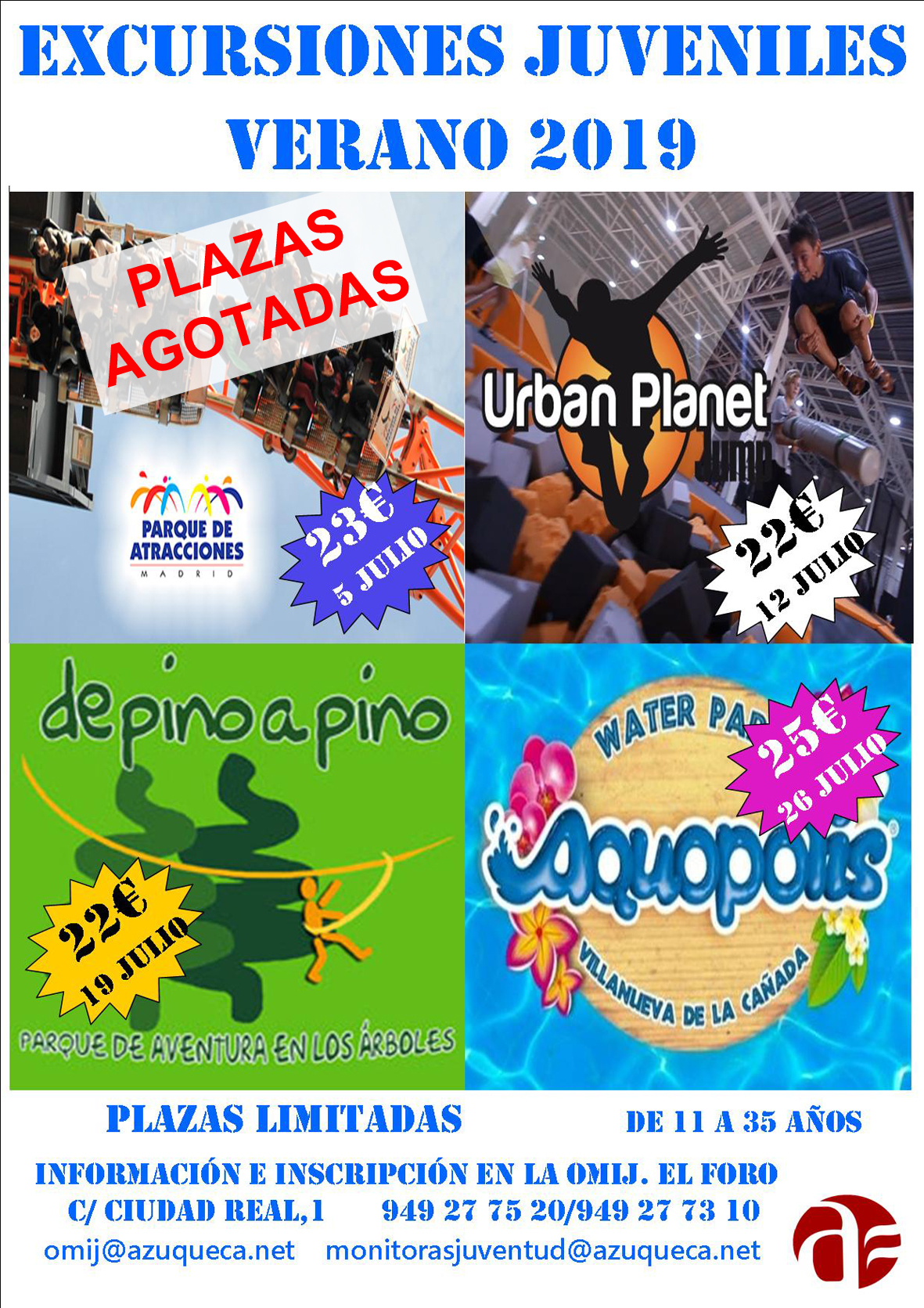 El Ayuntamiento de Azuqueca de Henares organiza varias excursiones durante el mes de julio dirigidas a la población juvenil. "Son propuestas de ocio saludable con las que se pretende ampliar la oferta municipal dirigida a nuestros jóvenes con actividades que dan respuesta a sus gustos y preferencias", indica la concejala de Igualdad de Oportunidades, Piedad Agudo.El calendario contempla cuatro salidas los viernes del mes de julio: el día 5, al Parque de Atracciones de Madrid (plazas agotadas); el día 12, a 'Urban Planet'; el día 19, a 'De pino a pino' y el día 26, al 'Aquópolis'. La inscripción está abierta a jóvenes de 11 a 35 años y puede tramitarse en la Oficina Municipal de Información Juvenil (OMIJ) de El Foro, en el teléfono 949 27 75 20 y los correos electrónicos