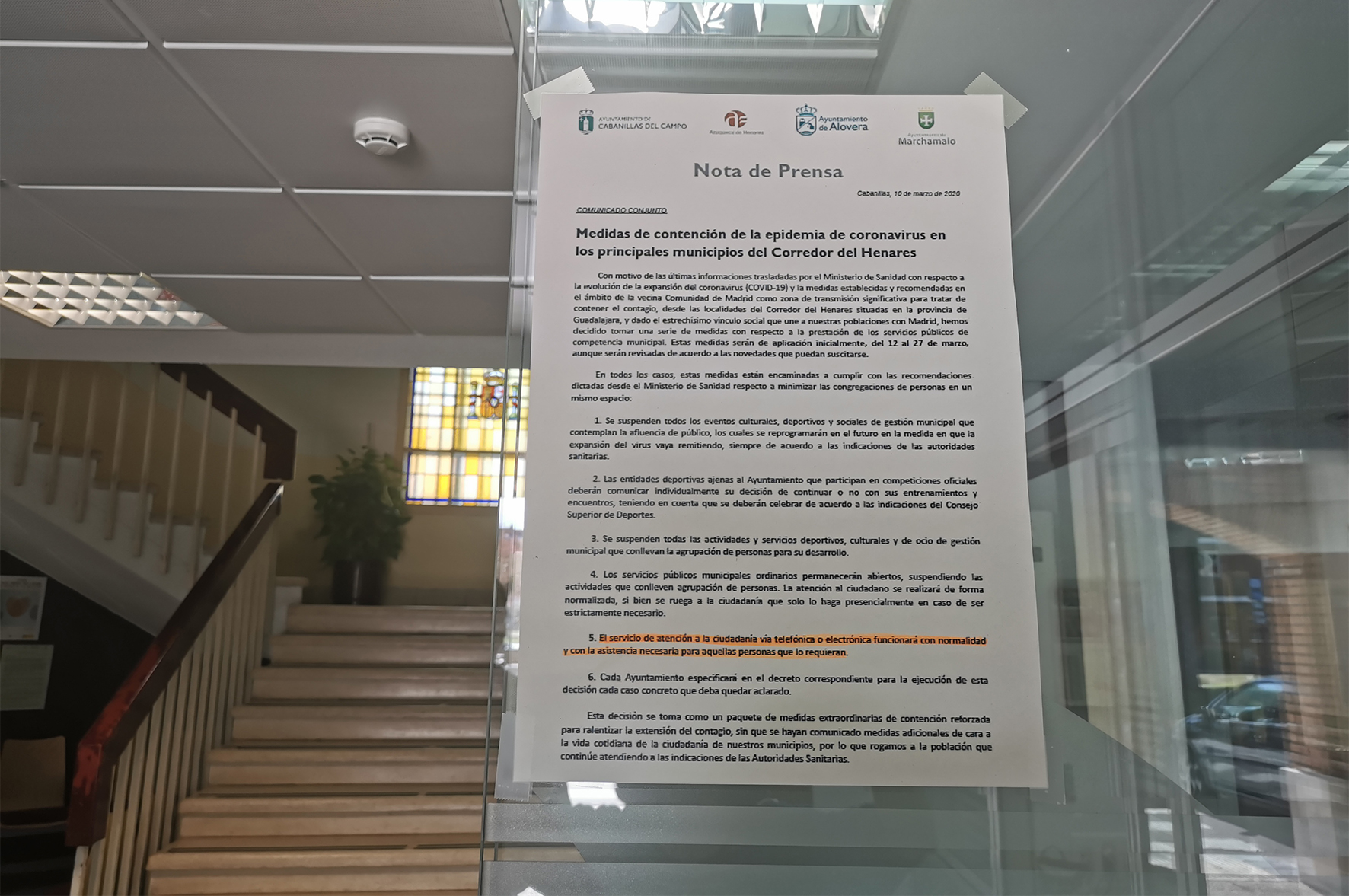 Este miércoles, se han concretado mediante un decreto firmado por el alcalde, José Luis Blanco, las medidas para limitar la propagación y el contagio por el COVID-19 en Azuqueca de Henares, tras las decisiones adoptadas de manera conjunta el martes con los Ayuntamientos vecinos de Cabanillas del Campo, Alovera y Marchamalo, atendiendo a las recomendaciones del Ministerio de Sanidad (pinche AQUÍ). En el decreto se recuerda "la cercanía e interrelación constante" de Azuqueca con Madrid, considerada como Zona de Transmisión Significativa del virus.Desde este jueves, día 12 de marzo, y hasta el próximo viernes 27 de marzo, "atendiendo a la evolución de la situación sanitaria en el Corredor del Henares" se adoptan las siguientes medidas:- Suspensión de todas las actividades culturales, deportivas, educativas y de ocio organizadas por el Ayuntamiento de Azuqueca de Henares.- Cierre al público de los edificios en los que se prestan estos servicios: Casa de la Cultura, Casita de los Cuentos, Centro de Ocio Río Henares, Cadif, Espacio Joven Europeo (EJE), El Foro, polideportivos La Paz, Arroyo del Vallejo y Ciudad de Azuqueca, Complejo Deportivo San Miguel y Piscina climatizada.- Suspensión del mercadillo semanal de los miércoles (días 18 y 25).- La atención a la ciudadanía se mantiene en los edficios municipales de la plaza de La Constitución (Ayuntamiento), parque de La Constitución, avenida de Meco, avenida de Los Escritores y calles de La Noguera y Las Eras.- Queda garantizada la atención telefónica y a través de internet para cualquier trámite con el Ayuntamiento.El decreto de Alcaldía finaliza recordado que "desde el Ayuntamiento se atenderá en todo momento cualquier indicación o recomendación realizada por el Ministerio de Sanidad".