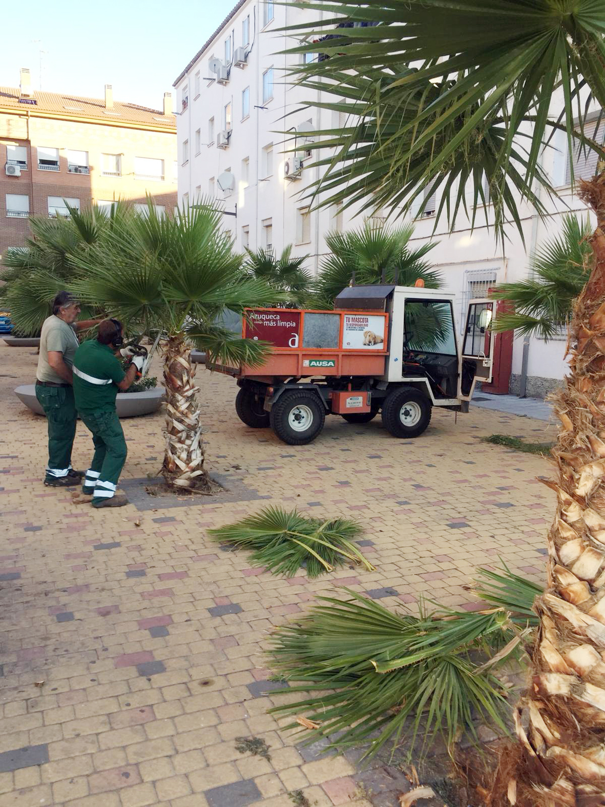 El Ayuntamiento de Azuqueca de Henares ha completado en la plaza de San Pedro los trabajos contemplados en el marco del Plan Estival de Jardinería. "Este plan da continuidad a las labores de cuidado y mantenimiento que durante el resto del año se desarrollan en los parques y las zonas verdes de la ciudad", explica el concejal de Ciudad Sostenible, Antonio Expósito, quien indica que, una vez finalizada esta intervención, se continuará por otras zonas, con trabajos de limpieza y poda (refaldado) de árboles, siguiendo criterios técnicos.Los trabajos en la plaza de san Pedro, acometidos por operarios municipales, han consistido en la poda de las catorce palmeras washintonias de la zona, así como mejoras ornamentales con la plantación de arbustos de flor. El edil recuerda que "estas palmeras se colocaron hace dos años en esta zona de Azuqueca dentro del programa de incorporación de nuevas especies al catálogo del municipio" y destaca "los resultados óptimos de adaptación". "Son unas palmeras ideales para los veranos calurosos, pero, al mismo tiempo, han soportado muy bien los inviernos fríos, por lo que son una especie que responde muy bien a las condiciones climatológicas de Azuqueca", explica Antonio Expósito.