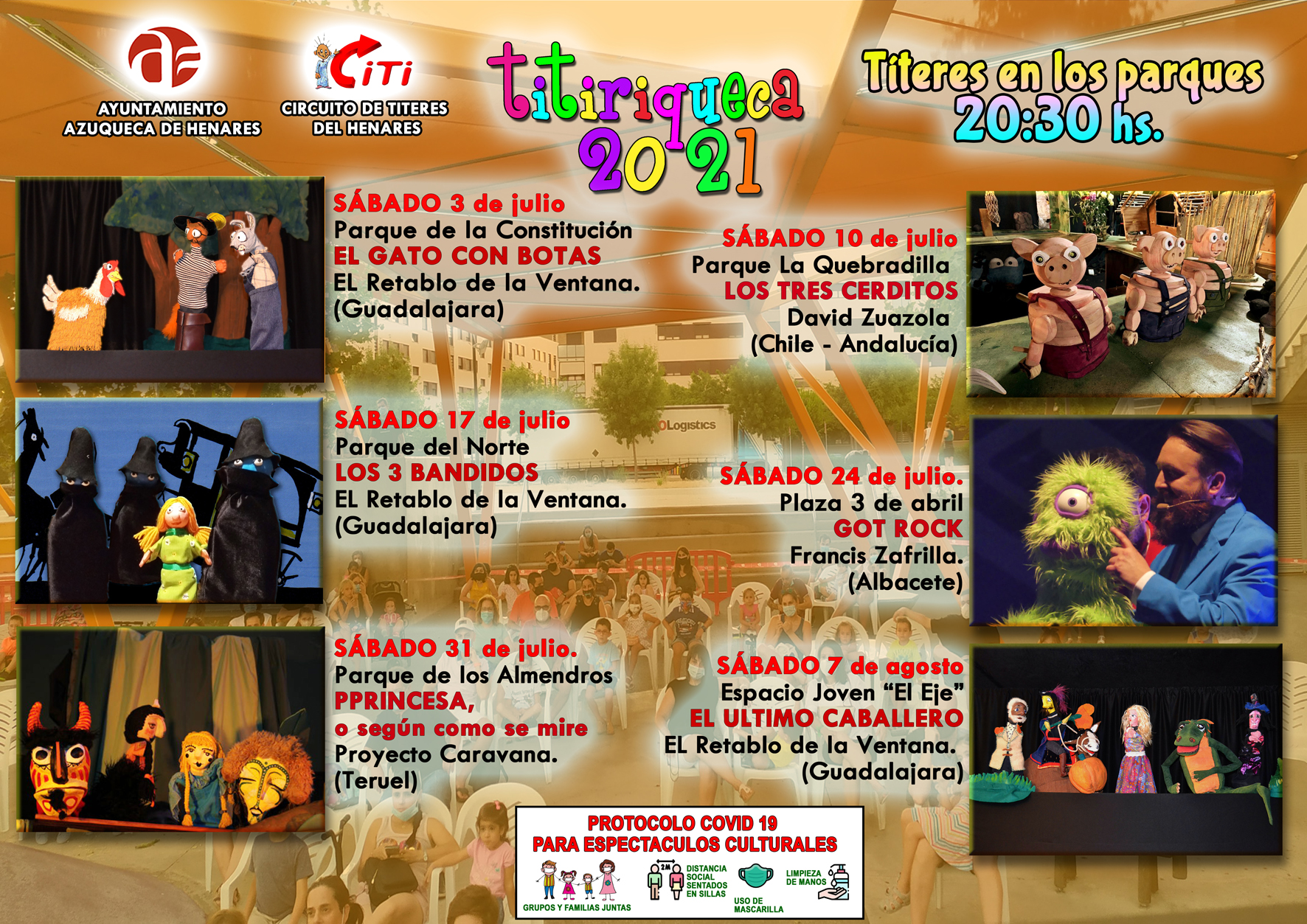 Entrada libreLas obras se van a representar cada sábado, a las 20:30 horas, entre el 3 de julio y el 7 de agosto. La entrada es libre hasta completar aforo. "Al igual que el año pasado, hemos elaborado un protocolo COVID-19 que recoge las medidas establecidas por las autoridades sanitarias para la prevención de contagios y que, en caso de novedades, se irá actualizando", explica Susana Santiago, quien agradece "la colaboración del público asistente".Programación- Sábado 3 de julio, 20:30 h., parque de La Constitución: Representación de la obra ‘El gato con botas’, de El Retablo de la Ventana (Guadalajara).