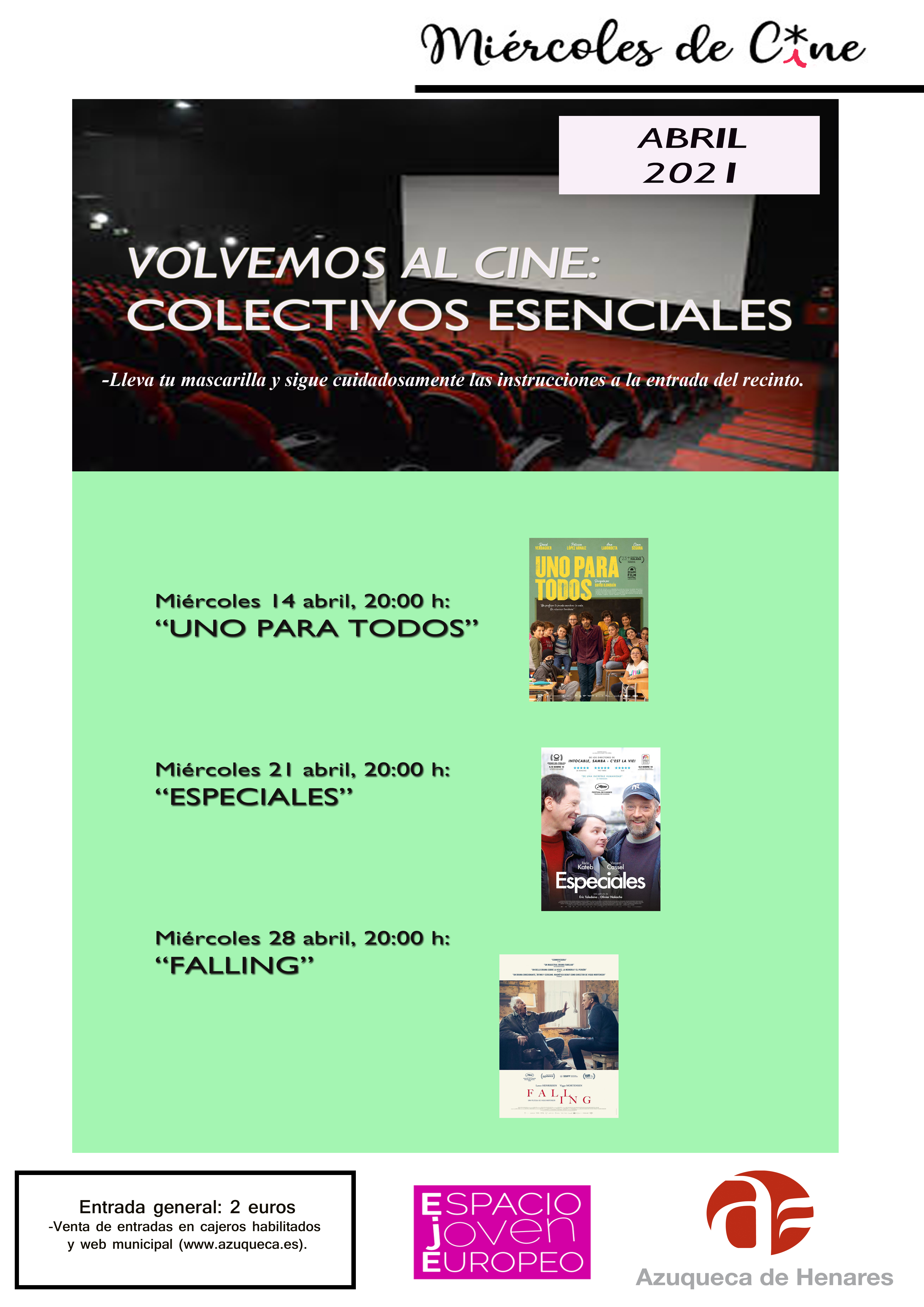 Las proyecciones de películas vuelven desde este miércoles, 14 de abril, a la sala del Espacio Joven Europeo (EJE) con la programación 'Miércoles de Cine' del Ayuntamiento de Azuqueca. Se ha previsto un ciclo centrado en colectivos esenciales con la proyección de las cintas 'Uno para todos' (día 14), 'Especiales' (día 21) y 'Falling' (día 28). Debido a la situación sanitaria (el viernes 9 de abril, Sanidad prorrogó las medidas de Nivel 3 en Azuqueca), el aforo de la sala se reduce al 20 por ciento (32 localidades) y se exigirá el cumplimiento de las medidas de prevención de contagios por COVID-19: uso obligatorio de mascarilla, y, en la entrada, toma de temperatura y la instalación de un puesto con gel hidroalcohólico desinfectante. "Para cumplir con la limitación de aforo, se ha bloqueado la venta del 80 por ciento de las butacas de la sala para que las espectadoras y espectadores guarden la distancia de seguridad durante las proyecciones de las películas", explica la concejala de Educación Global, Susana Santiago.Todas las sesiones comienzan a las 20 horas. Las entradas cuestan 2 euros y se tienen que adquirir de manera anticipada en los cajeros ciudadanos o en esta página web (AQUí). "Las localidades se sacan en el cajero del EJE que, después de cada uso, será desinfectado", detalla la edil. "El público mostrará la entrada al personal de sala que indicará la escalera por la que acceder al asiento asignado", añade. "La salida también será ordenada y coordinada por el personal, además de informarse por escrito y en pantalla", finaliza Susana Santiago, quien solicita la colaboración de la ciudadanía para cumplir con estas medidas de prevención de contagios y para atender cualquier otra indicación del personal.