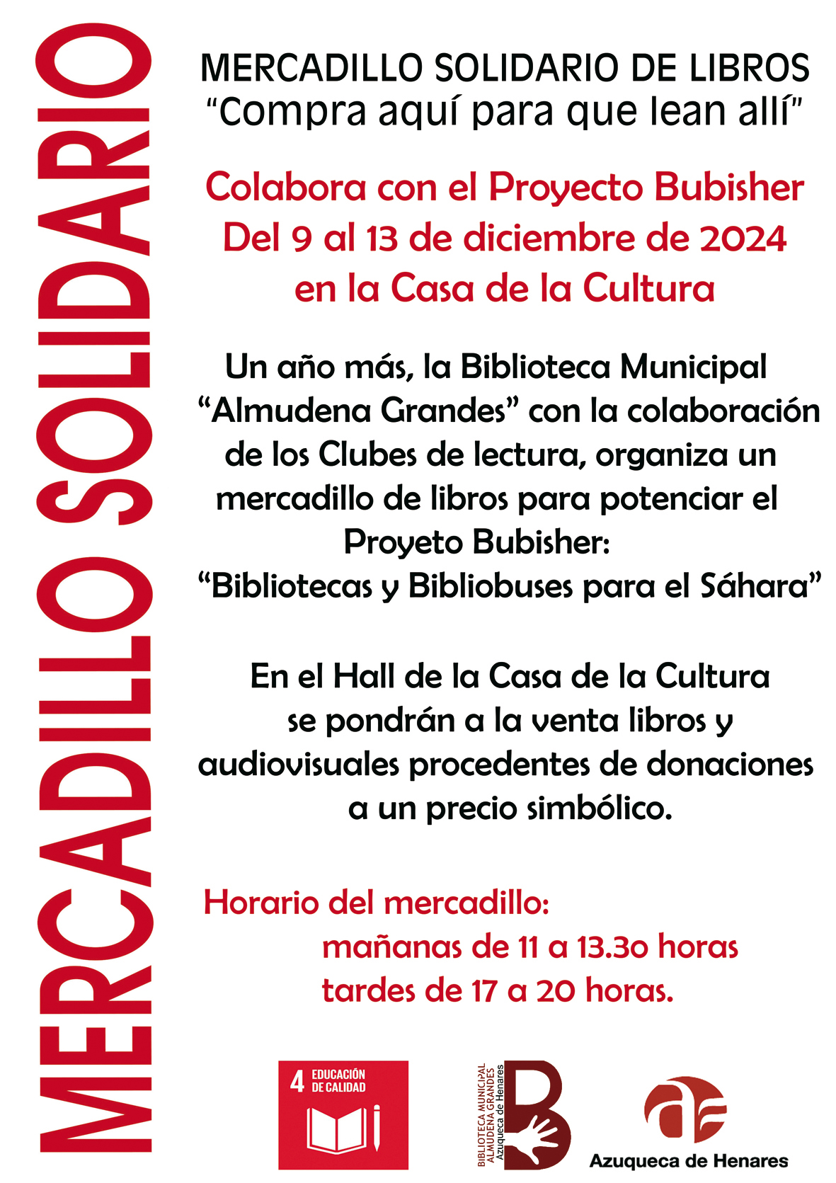 Entre el lunes 9 y el viernes 13 de diciembre, la entrada de la Casa de la Cultura de Azuqueca de Henares acoge una nueva edición del mercadillo solidario que impulsa la Biblioteca Municipal Almudena Grandes con la colaboración de los Clubes de Lectura. “Desde hace años, celebramos esta actividad que nos permite apoyar el proyecto Bubisher que acerca la lectura a menores, jóvenes y adultos de los campamentos de refugiados del Sáhara con la gestión de bibliotecas y de bibliobuses”, recuerda el alcalde azudense, Miguel Óscar Aparicio.