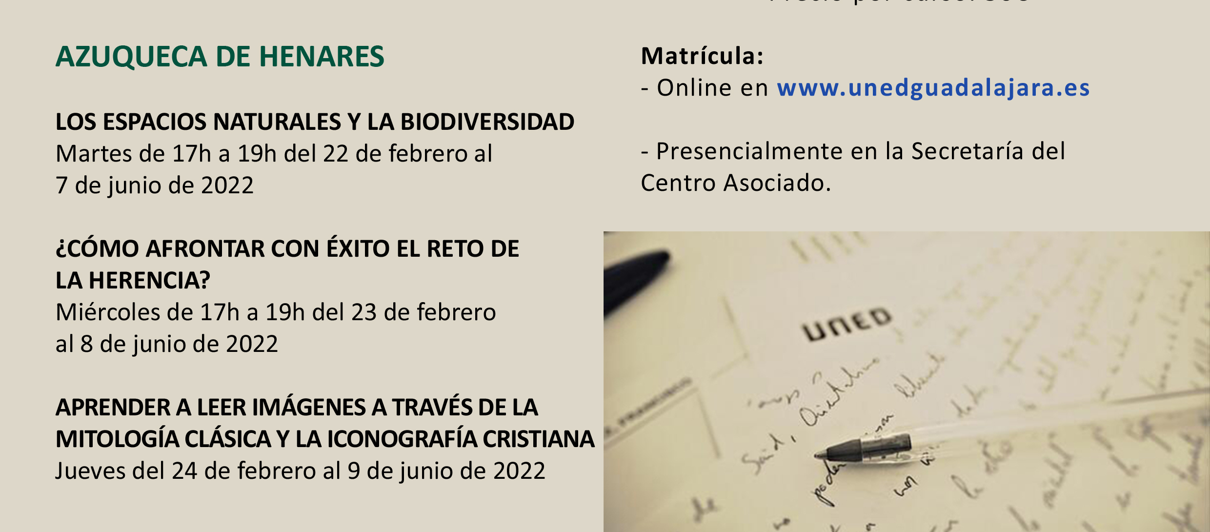 La UNED (Universidad Nacional de Educación a Distancia) ha abierto el plazo de inscripción en los tres cursos del programa UNED Senior que ofrece en el Aula de Azuqueca en el segundo trimestre de este curso: ‘Los espacios naturales y la diversidad’, ‘¿Cómo afrontar con éxito el reto de la herencia?’ y ‘Aprender a leer imágenes a través de la mitología clásica y la iconografía cristiana’. En el primer caso, las clases se impartirán los martes, de 17 a 19 horas, desde el 22 de febrero, al 7 de junio; el segundo, los miércoles en el mismo horario, desde el 23 de febrero al 8 de junio y el tercero, los jueves, desde el 24 de febrero al 9 de junio.