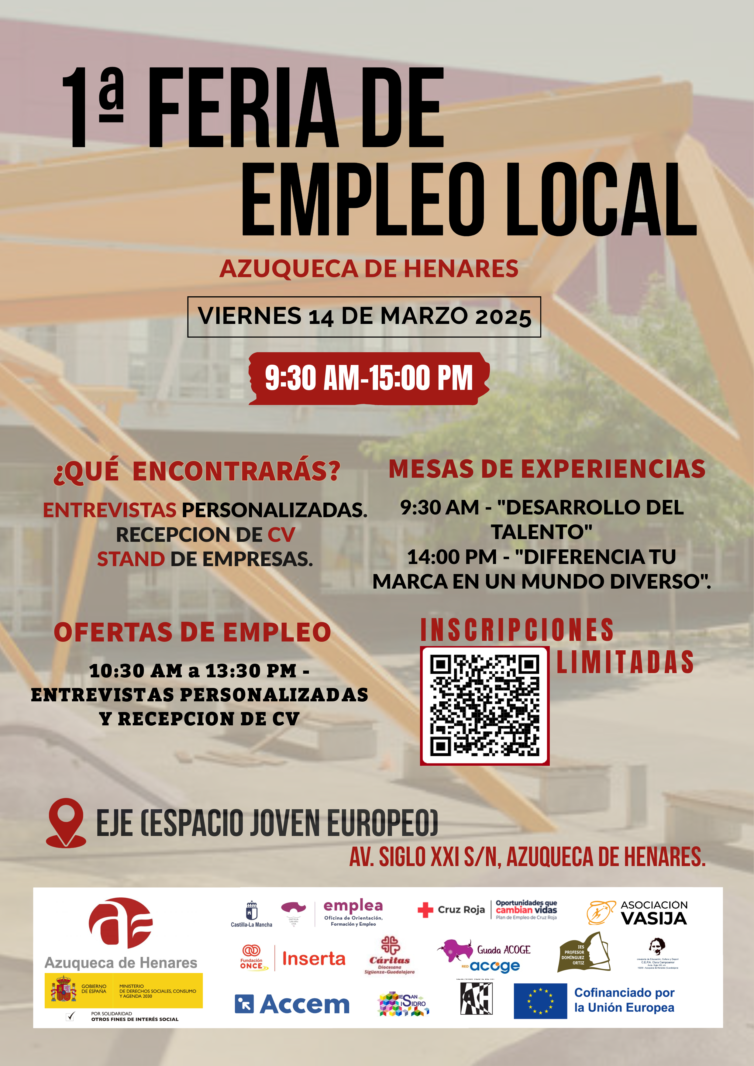 El Ayuntamiento de Azuqueca abre este viernes, día 28, el plazo de inscripción en la I Feria de Empleo Local, que se va a celebrar el 14 de marzo, de 9:30 a 15 horas, en las instalaciones municipales del Espacio Joven Europeo (EJE). El alcalde, Miguel Óscar Aparicio, explica que “el objetivo de esta iniciativa es ampliar las oportunidades laborales de las personas que están buscando empleo, especialmente de la población más joven y, al mismo tiempo, facilitar a las empresas la selección del talento local para cubrir las necesidades de sus plantillas”.