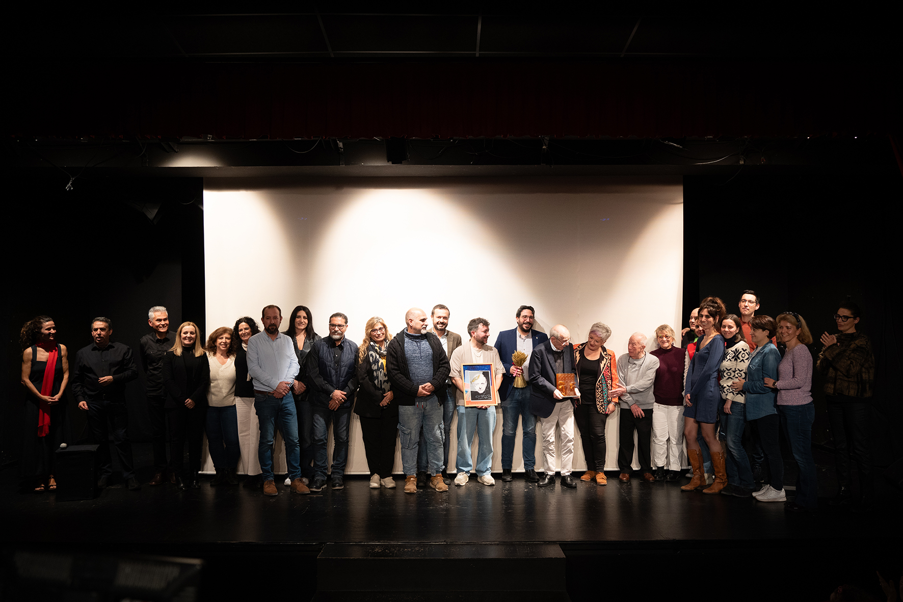 Participantes en el acto, junto al actor, sobre el escenario de la Casa de la Cultura