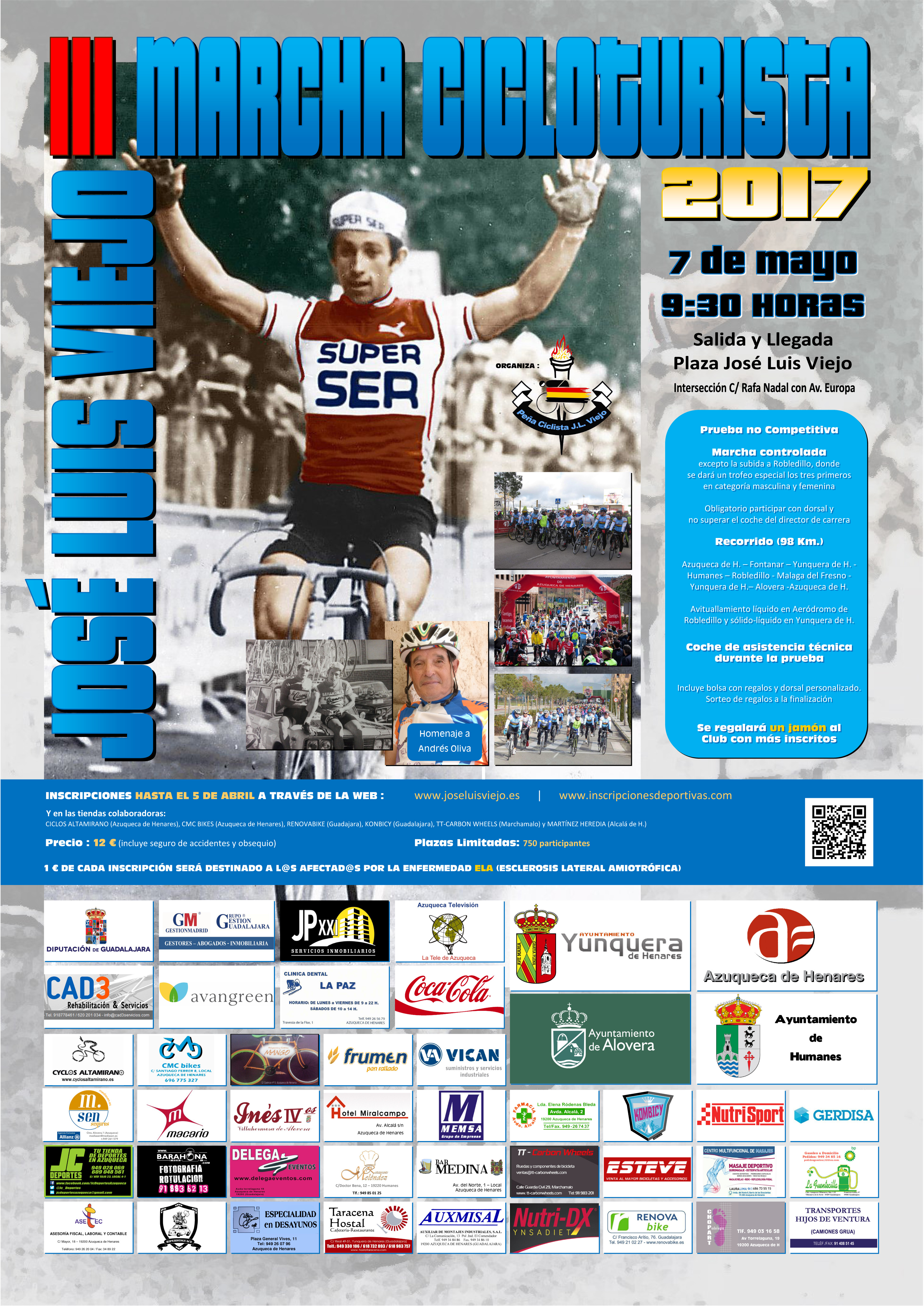 La III Marcha Cicloturista José Luis Viejo ha modificado su fecha de celebración y finalmente se correrá el domingo 7 de mayo. Según ha comunicado la Peña Ciclista José Luis Viejo, organizadora del evento, la Jefatura Provincial de Tráfico no ha autorizado la marcha para el domingo 9 de abril "por la cercanía con la Semana Santa ya que tiene un dispositivo especial desde el 7 de abril hasta el 25 de abril, durante el cual no se puede autorizar ninguna prueba de ningún tipo por carretera a nivel nacional".La peña lamenta "los problemas ocasionados a todos los que están inscritos y no puedan o no quieran participar en la nueva fecha". En este sentido, aclara que quienes deseen anular la inscripción deben dirigirse por correo electrónico a joseluisviejo@outlook.com o a gestion@inscripcionesdeportivas.com hasta el día 9 de abril. El dinero se comenzará a devolver a partir del 12 de abril. Las personas que quieran participar en la nueva fecha no deben realizar ninguna gestión. Los interesados en participar en la nueva fecha, tienen de plazo hasta el día 5 de mayo para formalizar su inscripción.Prueba no competitivaLa marcha, que organiza la peña con la colaboración del Ayuntamiento de Azuqueca de Henares, abarca una distancia de 98 kilómetros por la provincia de Guadalajara. En concreto, el recorrido tiene salida y llegada en la plaza José Luis Viejo, en la intersección de la calle Rafa Nadal con la avenida de Europa de Azuqueca, y discurre por Fontanar, Yunquera, Humanes, Robledillo, Málaga del Fresno y Alovera. Es una prueba no competitiva, excepto en la subida a Robledillo, punto en el que se dará un trofeo especial a los tres más rápidos, en categoría masculina y femenina.El precio del dorsal es de 12 euros e incluye seguro de accidente, bolsa de regalos y dorsal personalizado. Además, un euro se destina a las personas afectadas por la enfernedad Esclerosis Lateral Amiotrófica (ELA). Las inscripciones se pueden cursar online en las páginas web www.joseluisviejo.es y en www.inscripcionesdeportivas.com, o bien, de manera presencial en las tiendas colaboradoras Ciclos Altamirano y CMC Bikes, de Azuqueca; Renovabike y Konbicy, de Guadalajara; TT-Carbon Wheels, de Marchamalo, y Martínez Heredia, de Alcalá de Henares.