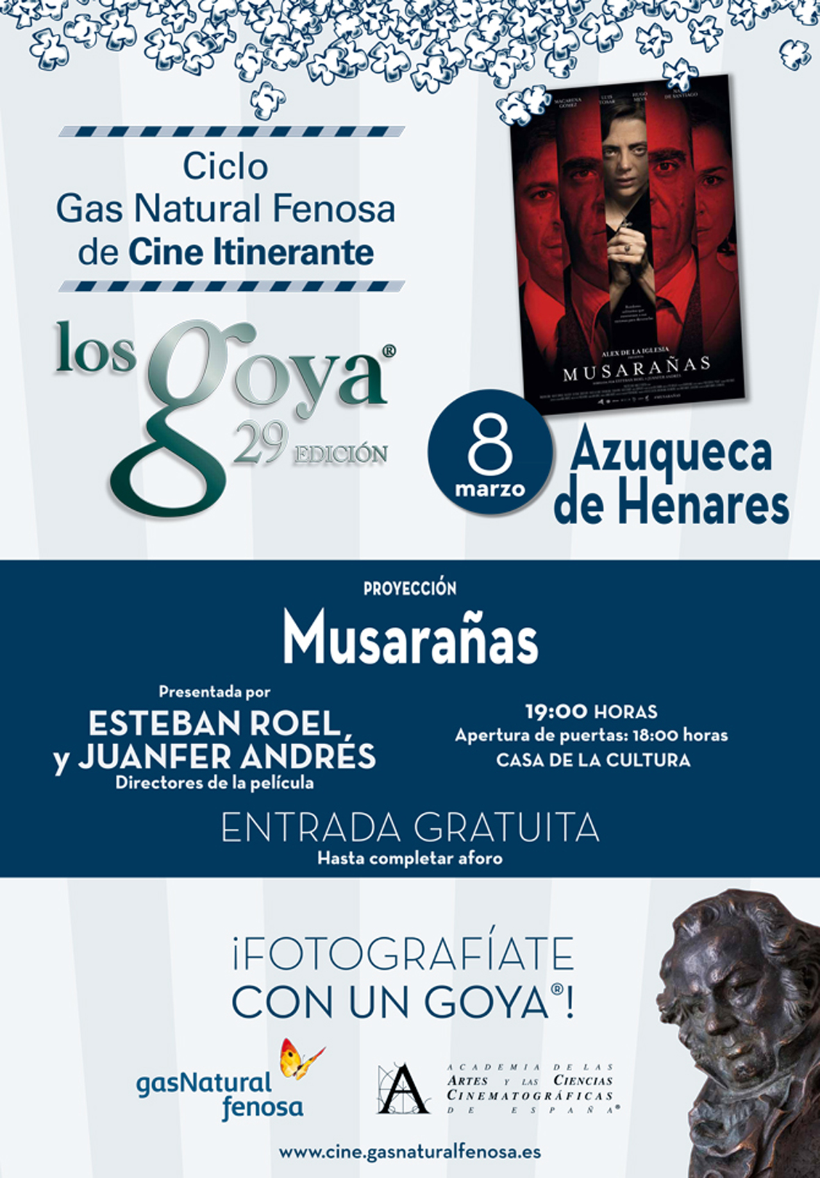 Azuqueca de Henares acoge el 8 de marzo la sesión que cierra la cuarta edición del Ciclo Gas Natural Fenosa de Cine Itinerante, impulsada conjuntamente por la Academia de Cine y la compañía energética, que comenzó el 30 de enero y ha visitado otras nueve localidades de todo el país. "Se trata de una iniciativa que apuesta por la proyección gratuita de películas de producción nacional", explica la concejala de Cultura, Sandra Yagüe, quien agradece la inclusión de Azuqueca en este ciclo que "acerca la cultura cinematográfica a la ciudadanía".En concreto, el domingo 8, a las 19 horas, se podrá ver Musarañas en la Casa de la Cultura en un acto que contará con la presencia de Esteban Roel y Juanfer Andrés, directores de la cinta nominados a la Mejor Dirección Novel en la 29 edición de los Goya®. De manera previa al inicio de la sesión, desde las 18 horas, los espectadores podrán conocer a los directores y fotografiarse con un Premio Goya®. La entrada es gratuita, previa retirada de las invitaciones en taquilla, desde las 17 horas y hasta completar el aforo.