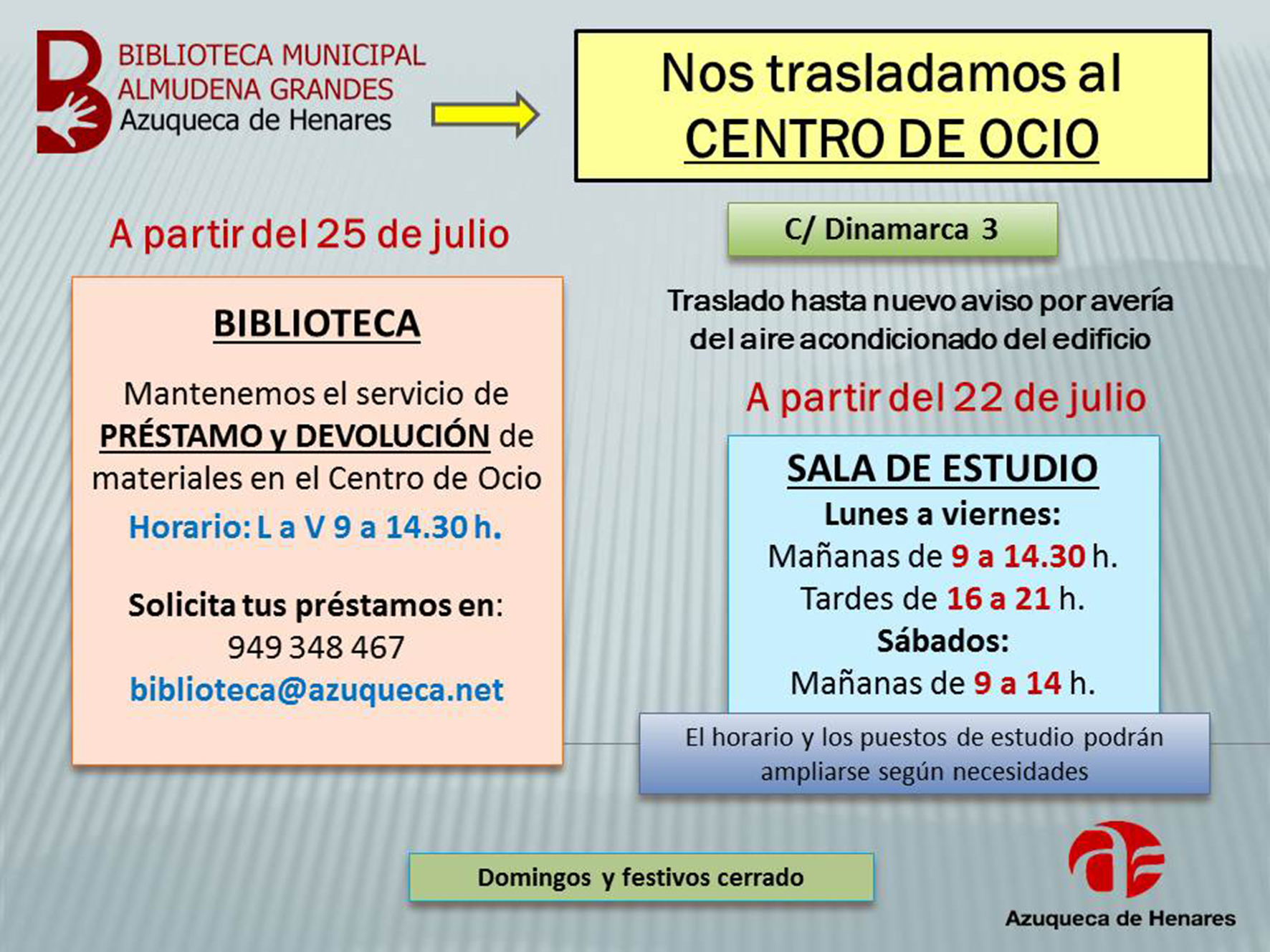 También el uso de la Biblioteca Municipal Almudena Grandes se ve condicionado por esta avería en la climatización de la Casa de la Cultura. En este caso, a partir de lunes, día 25, se pondrá en marcha un punto de Biblioteca que ofrecerá el servicio de préstamo de materiales con cita previa. “Es el mismo sistema que ya utilizamos durante la pandemia: los usuarios y usuarias solicitan los materiales por teléfono, en el 949 34 84 67, o por correo electrónico, a través de biblioteca@azuqueca.net, y los podrán recoger en el Centro de Ocio Río Henares, donde también se harán las devoluciones”. En este caso, el horario del servicio será el de verano: de lunes a viernes, de 9 a 14:30 horas.