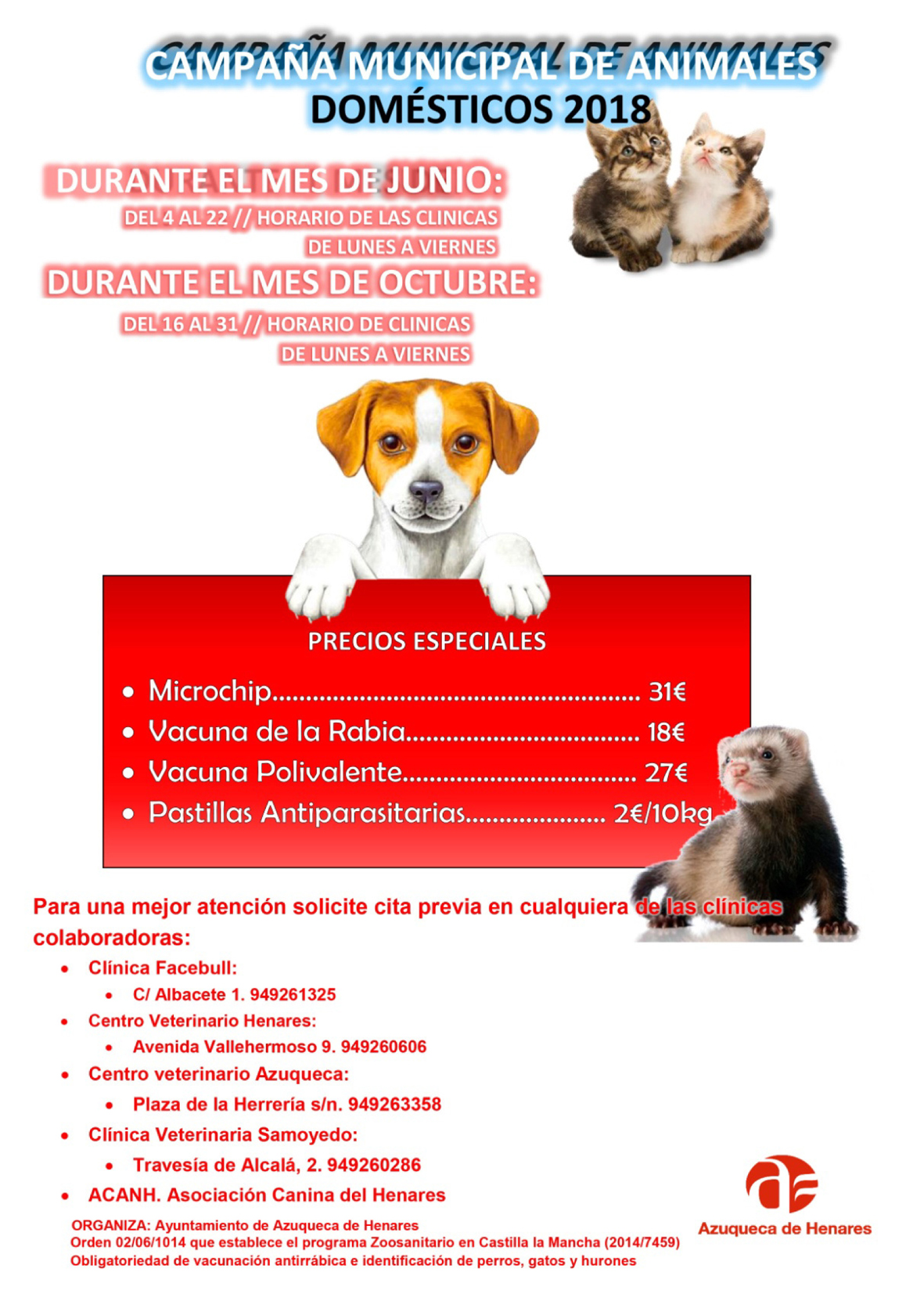 Desde este martes, 16 de octubre, y hasta el último día de mes, el miércoles 31, se va a desarrollar una nueva edición de la campaña de animales domésticos que impulsa el Ayuntamiento de Azuqueca de Henares. "Desde hace años, ponemos en marcha esta medida con el objetivo de facilitar que los vecinos y vecinas de la ciudad con mascotas a su cargo puedan cumplir con la legislación vigente y que marca la obligatoriedad de la vacunación antirrábica y la identificación de perros, gatos y hurones", explica la concejala de Promoción de la Salud, Charo Martín, quien recuerda que ya se programó una primera fase en junio.