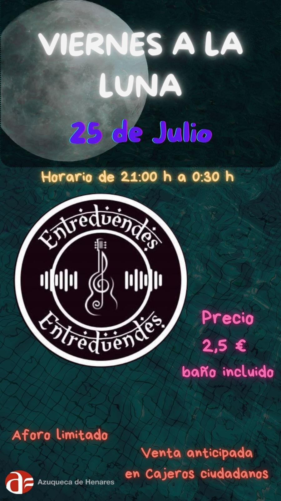 Entreduendes y su música flamenca pondrán la animación al segundo Viernes a la Luna programado por el Ayuntamiento de Azuqueca de Henares este verano. Las entradas para la sesión (este viernes, 25 de julio, en la piscina municipal de verano -complejo San Miguel- ) ya están a la venta en los cajeros ciudadanos al precio de 2,5 euros. El recinto abrirá sus puertas a las 21 horas y se podrá disfrutar del baño libre y de la actuación musical hasta las 00:30 horas.