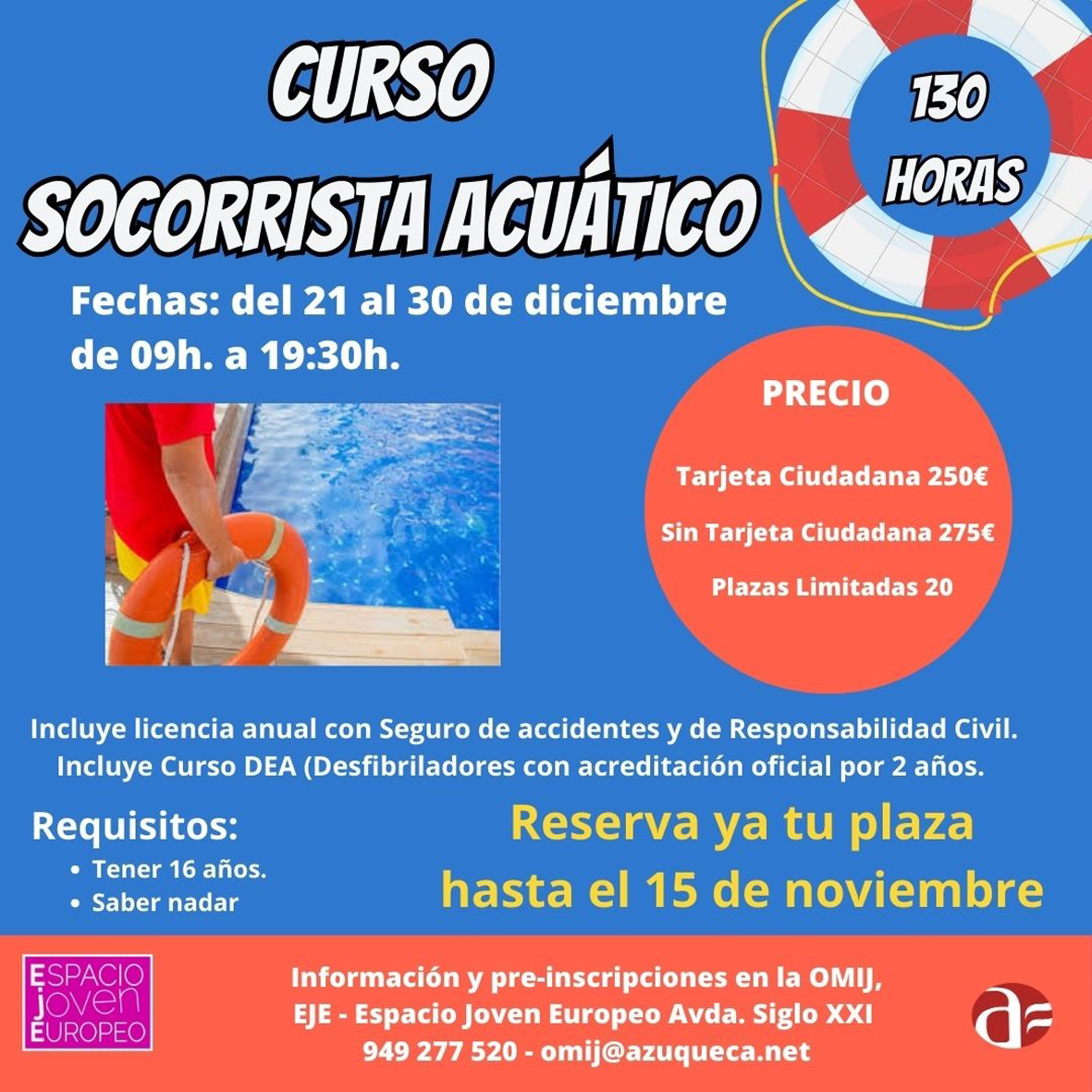 El Ayuntamiento de Azuqueca de Henares organiza un curso de socorrista acuático para mayores de 16 años, que se impartirá en días no lectivos del 21 al 30 de diciembre de 9 a 19:30 horas. “Apostamos por esta formación porque, al igual que en las sesiones de monitor de actividades de ocio, mejora la empleabilidad de nuestras y nuestros jóvenes y, de cara a los meses de verano, les permite acceder a un puesto de trabajo”, explica el concejal del área, Enrique Pérez de la Cruz.