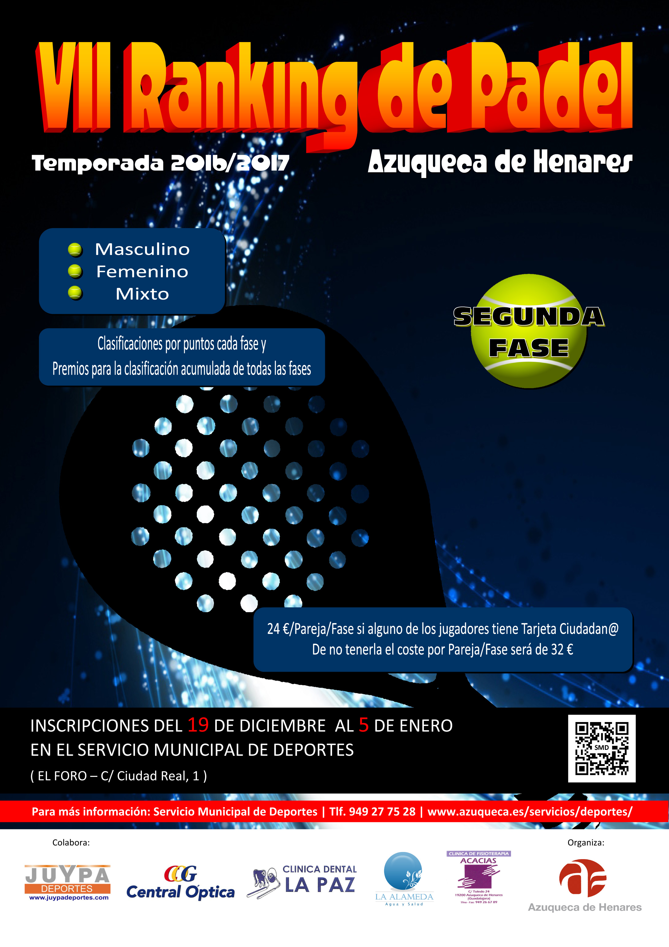 Desde este lunes, 19 de diciembre, y hasta el próximo 5 de enero, está abierto el plazo de inscripción en la segunda fase del VII Ranking de Pádel que organiza el Ayuntamiento de Azuqueca de Henares. Los interesados deben dirigirse al Servicio Municipal de Deportes, en El Foro. Al igual que en el primera fase, la competición se estructura en torno a las categorías masculina, femenina y mixta. Los partidos comenzarán la semana del 9 de enero, según las previsiones de Deportes.El precio de participación es de 24 euros por pareja si al menos uno de los dos componentes es titular de la Tarjeta Ciudadana y de 32 si ninguno de ellos cuenta con este título municipal. Se contemplan reducciones en el precio para categoría mixta en el caso de que los dos integrantes de la pareja participen en otra categoría y, al menos, uno de ellos cuente con la Tarjeta Ciudadana. Esta segunda fase del Ranking de Pádel sucede a la primera, que se ha disputado desde el pasado 17 de octubre y en la que han participado un centenar de parejas: 64 en la categoría absoluta, 14 en la femenina y 22 en la mixta.