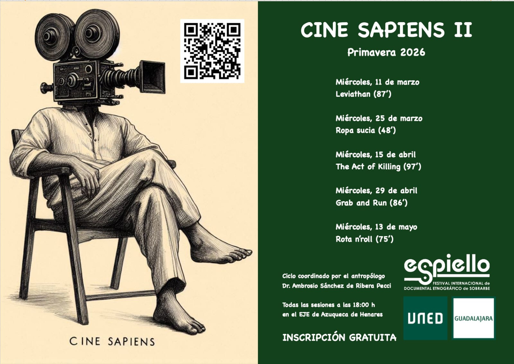 La Universidad Nacional de Educación a Distancia (UNED) ha abierto la inscripción en el ciclo de Cine Antropológico “Cine Sapiens II”, programado Azuqueca de Henares entre el 11 de marzo y el 13 de mayo como Actividad de Extensión Universitaria. La participación es gratuita y la inscripción se puede hacer a través de la página web de la UNED de Guadalajara (AQUÍ).
