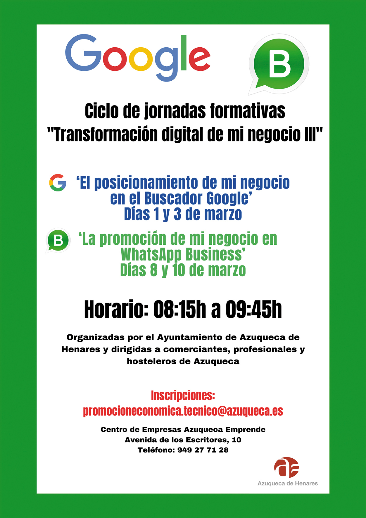 El ciclo de Jornadas Formativas impulsado por el Ayuntamiento de Azuqueca para ayudar a los comerciantes, profesionales de servicios y hosteleros a incrementar sus ventas aprovechando las nuevas tecnologías continúa en marzo con dos jornadas tituladas ‘El posicionamiento de mi negocio en el buscador Google’ y ‘La promoción de mi negocio en WhatsApp Business’. La primera sesión se celebrará los días 1 y 3 de marzo y la segunda, los días 8 y 10.