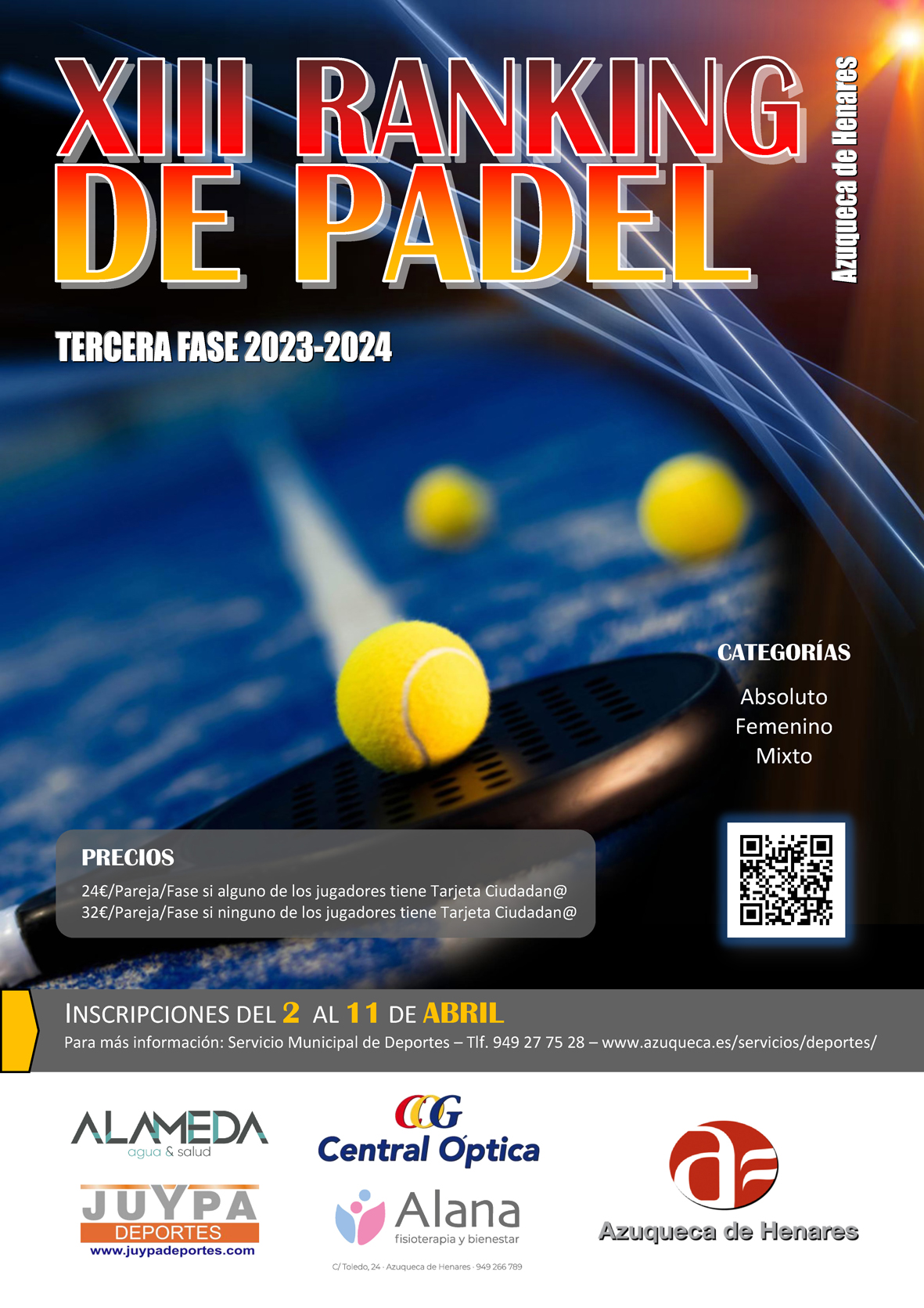 Desde este martes día 2 y hasta el jueves 11 de abril, el Ayuntamiento de Azuqueca de Henares mantiene abierto el plazo de inscripción en la tercera y última fase del Ranking de Pádel, que esta temporada alcanza su edición número 13.