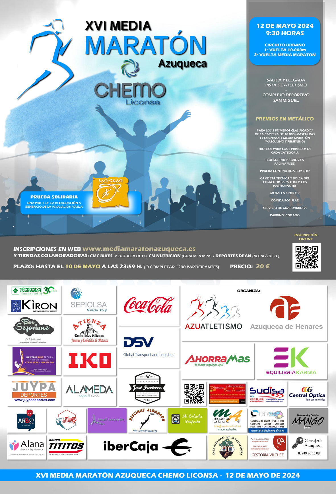 El precio es de 20 euros para las dos distancias e incluye bolsa del corredor con camiseta técnica. La prueba mantiene el carácter solidario de ediciones pasadas y una parte de la recaudación se donará a la asociación Vasija, que desarrolla proyectos de apoyo a jóvenes en situación o en riesgo de vulnerabilidad de Azuqueca. Las personas interesadas en correr la Media Maratón Azuqueca Chemo-Liconsa pueden tramitar su participación en la página web www.mediamaratonazuqueca.es (pinche AQUÍ) y de manera presencial en las tiendas colaboradoras: CMC Bikes (Azuqueca), CM Nutrición (Guadalajara) y Deportes Dean (Alcalá de Henares). El plazo de inscripción se cierra a las 23:59 horas del 10 de mayo (la fecha límite para el dorsal personalizado son las 23:59 del 7 de mayo) o si se agotan los 1.200 dorsales disponibles.