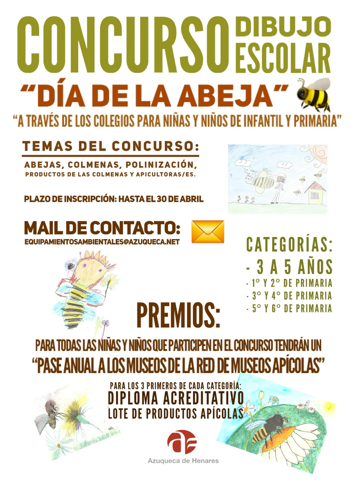 Hasta el 30 de abril, se mantiene abierto el plazo de inscripción en el concurso de dibujo escolar convocado por el Ayuntamiento de Azuqueca de Henares con motivo del Día de la Abeja, que se conmemora cada 20 de mayo. La actividad se dirige al alumnado de Infantil y Primaria y cuenta con cuatro categorías: 3 a 5 años, 1º y 2º de Primaria, 3º y 4º de Primaria y, por último, 5º y 6º de Primaria. "El objetivo de este concurso es acercar el mundo de las abejas y la apicultura a los niños y niñas para que, de este modo, tomen conciencia de su importancia ya que facilitan la polinización y contribuyen activamente a la supervivencia de muchas especies de plantas que se reproducen gracias a que estos insectos transportan el polen al alimentarse del néctar de las flores", explica el concejal de Buen Gobierno, Álvaro Cuevas.Temas y premiosLas abejas, las colmenas, la polinización, los productos de las colmenas y apicultores son los temas del concurso. En cuanto a los premios, cada participante va a recibir un pase anual de acceso a la Red de Museos Apícolas, de la que forma parte el Aula Apícola de Azuqueca de Henares y que suma un total de 24 centros. Además, en cada categoría, se entregarán a los tres primeros un diploma acreditativo y un lote de productos apícolas.Más información, en el correo electrónico