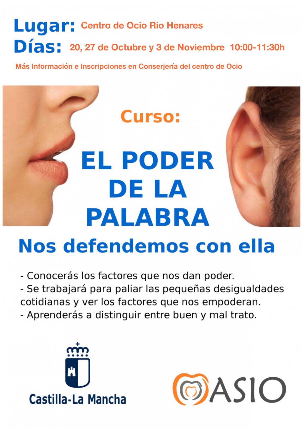 El Centro de Ocio Río Henares acoge el curso 'El poder de la palabra' que se dirige a personas mayores. La actividad es gratuita y contempla tres sesiones, que se van a impartir por la mañana, de 10 a 11:30 horas, los viernes 20 y 27 de octubre y 3 de noviembre. La inscripción ya está abierta y puede formalizarse en la conserjería del Centro de Ocio.Los contenidos del curso, que oferta la Junta de Comunidades de Castilla-La Mancha, se centran en los factores que dan poder, en el trabajo para paliar las pequeñas desigualdades cotidianas y en la distinción entre el buen y el mal trato.Propuestas municipales"Esta actividad se suma a la programación que impulsa el Ayuntamiento de Azuqueca de Henares con el fin de dar respuesta a las necesidades e inquietudes de nuestras personas mayores", recuerda la concejala del área, Rufi Fernández, quien destaca que "se da cabida a propuestas formativas y lúdicas". El curso 2017/2018 incluye algunas novedades como el taller creativo y manualidades (jueves, 18 h.), iniciación al inglés (jueves, 17 h.), teatro (martes, 17 h.) e informática básica (lunes, 17 y 18 h.). "Además, se mantienen las sesiones de memoria y estimulación cognitiva, la gimnasia, los paseos saludables, los grupos de autoayuda y el baile de los sábados y domingo", repasa la edil. Además, las mañanas de los viernes se organizan distintas actividades. La propuesta de este viernes, 13 de octubre, consiste en un videoforum que comenzará a las 10:30 horas.Más información e inscripciones, en la conserjería del Centro de Ocio.