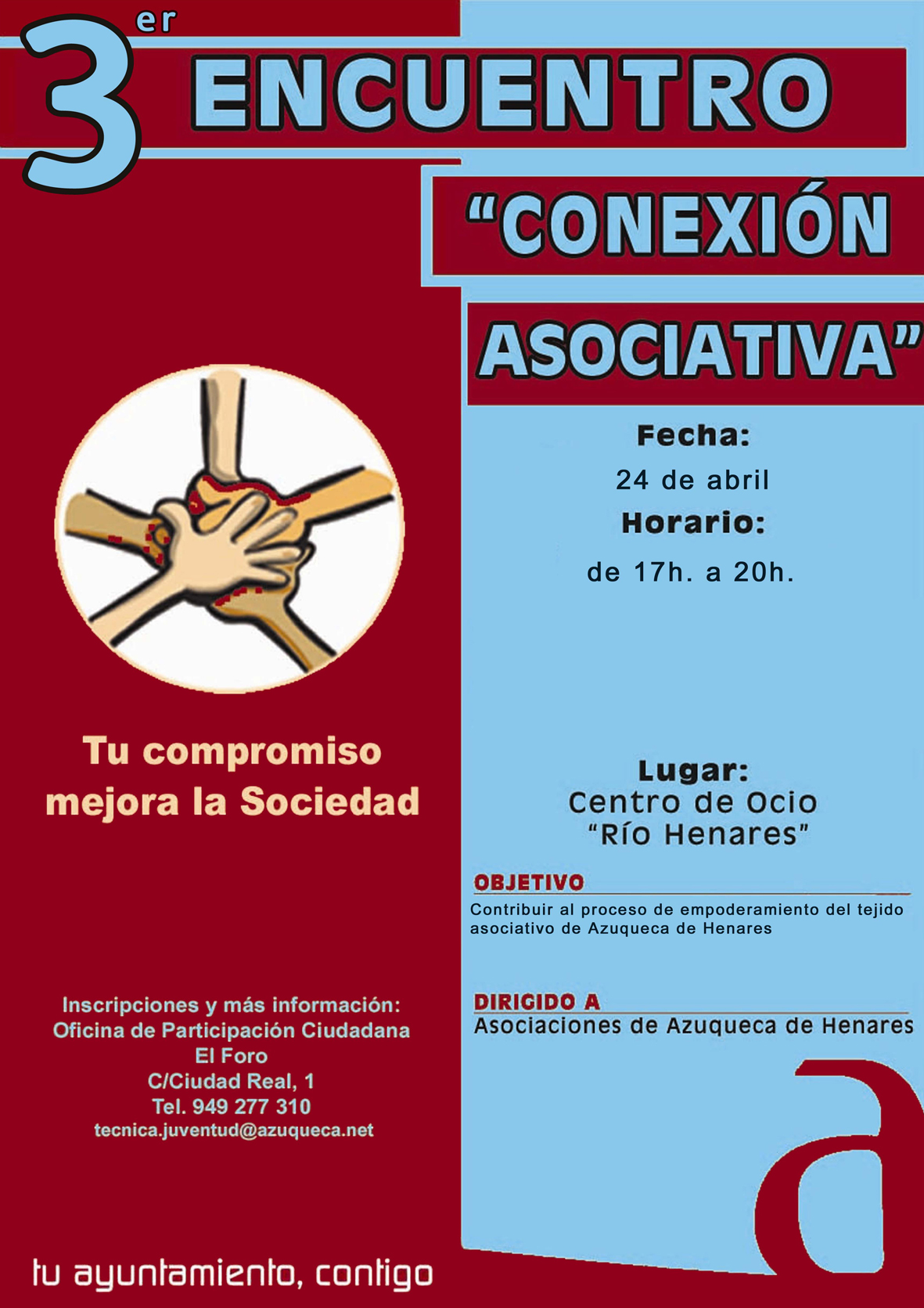 El viernes 24 de abril, el Ayuntamiento de Azuqueca de Henares celebra la tercera edición del encuentro 'Conexión asociativa'. Bajo el lema 'Tu compromiso mejora la sociedad', la sesión tendrá lugar en el Centro de Ocio, por la tarde, de 17 a 20 horas. Esta propuesta se dirige a las asociaciones del municipio, con independencia del área de su actividad. El objetivo es ofrecer un espacio para intercambiar experiencias e ideas que permitan fortalecer y fomentar el tejido asociativo local.La inscripción puede formalizarse ya en la oficina de Participación Ciudadana, ubicada en la primera planta de El Foro. Más información, en el teléfono 949 27 73 10 y en el correo electrónico