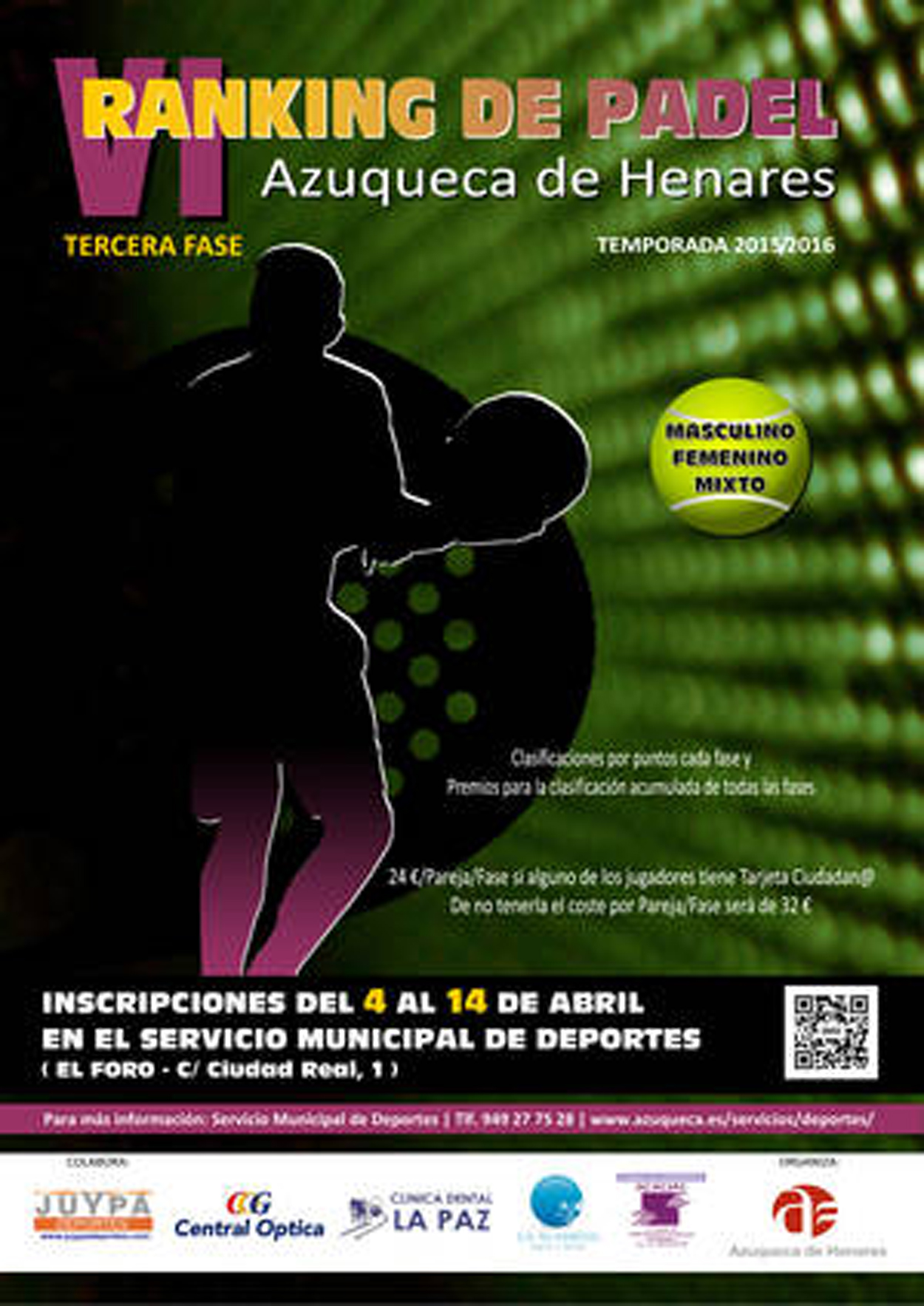 Desde este lunes, día 4 y hasta el próximo 14 de abril, se puede formalizar la participación en la tercera fase del Ranking de Pádel de Azuqueca de Henares, que impulsa desde hace seis temporadas el Ayuntamiento, en el marco de su programación deportiva anual. Los interesados deben dirigirse al Servicio Municipal de Deportes, en El Foro (C/ Ciudad Real).La competición se organiza en torno a tres categorías: Masculina, Femenina y Mixta. El precio por pareja y fase es de 24 euros, si alguno de los jugadores es titular de la Tarjeta Ciudadana, y de 32 euros, en caso de carecer de este documento municipal. Los modelos para formalizar la inscripción se pueden descargar AQUÍ.