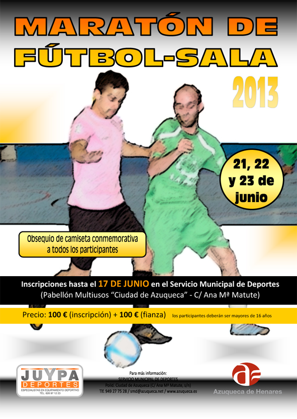 Por otra parte, el Maratón del Fútbol Sala se celebrará desde el viernes 21 hasta el domingo 23 de junio. "Las inscripciones se pueden formalizar desde este lunes, 3 de junio, hasta el día 17, en el Servicio Municipal de Deportes, ubicado en el pabellón Ciudad de Azuqueca", señala el concejal, quien recuerda que esta cita "se ha convertido en habitual, debido a la buena acogida que tiene”. La cuota de inscripción se ha establecido en 100 euros por equipo. Más información, pinche AQUÍ.