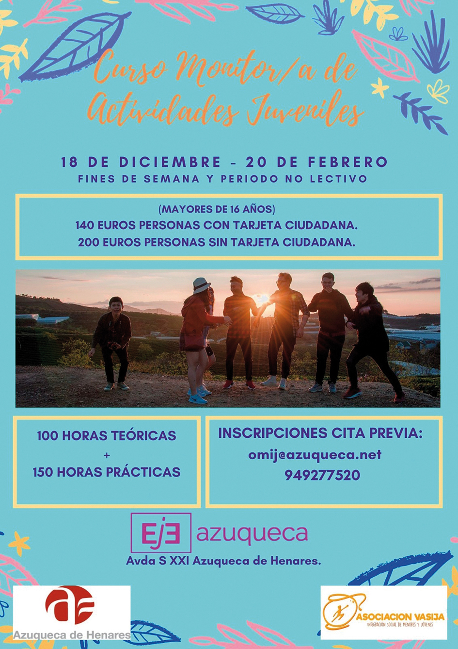 El Ayuntamiento de Azuqueca de Henares ha organizado una nueva edición del Curso de Monitor/a de Actividades Juveniles. Podrán participar personas mayores de 16 años, que, además de la formación específica, recibirán orientación laboral y entrarán a formar parte de una bolsa de empleo. Las sesiones del curso se desarrollarán en el  Espacio Joven Europeo (EJE) entre el 18 de diciembre y el 20 de febrero, en sábados y domingos y periodo no lectivo (vacaciones navideñas). El precio es de 140 euros para titulares de la Tarjeta ciudadana y 200 para el resto de personas que no dispongan de este título que emite el Ayuntamiento de Azuqueca. La tarifa incluye, además de la formación, una salida de dos días a un albergue juvenil, con alojamiento, transporte y manutención. La inscripción está abierta y debe tramitarse en la Oficina de Información Juvenil (OMIJ), en el EJE, con cita previa que se debe solicitar en el correo electrónico omij@azuqueca.net o a través del teléfono 949 27 75 20.