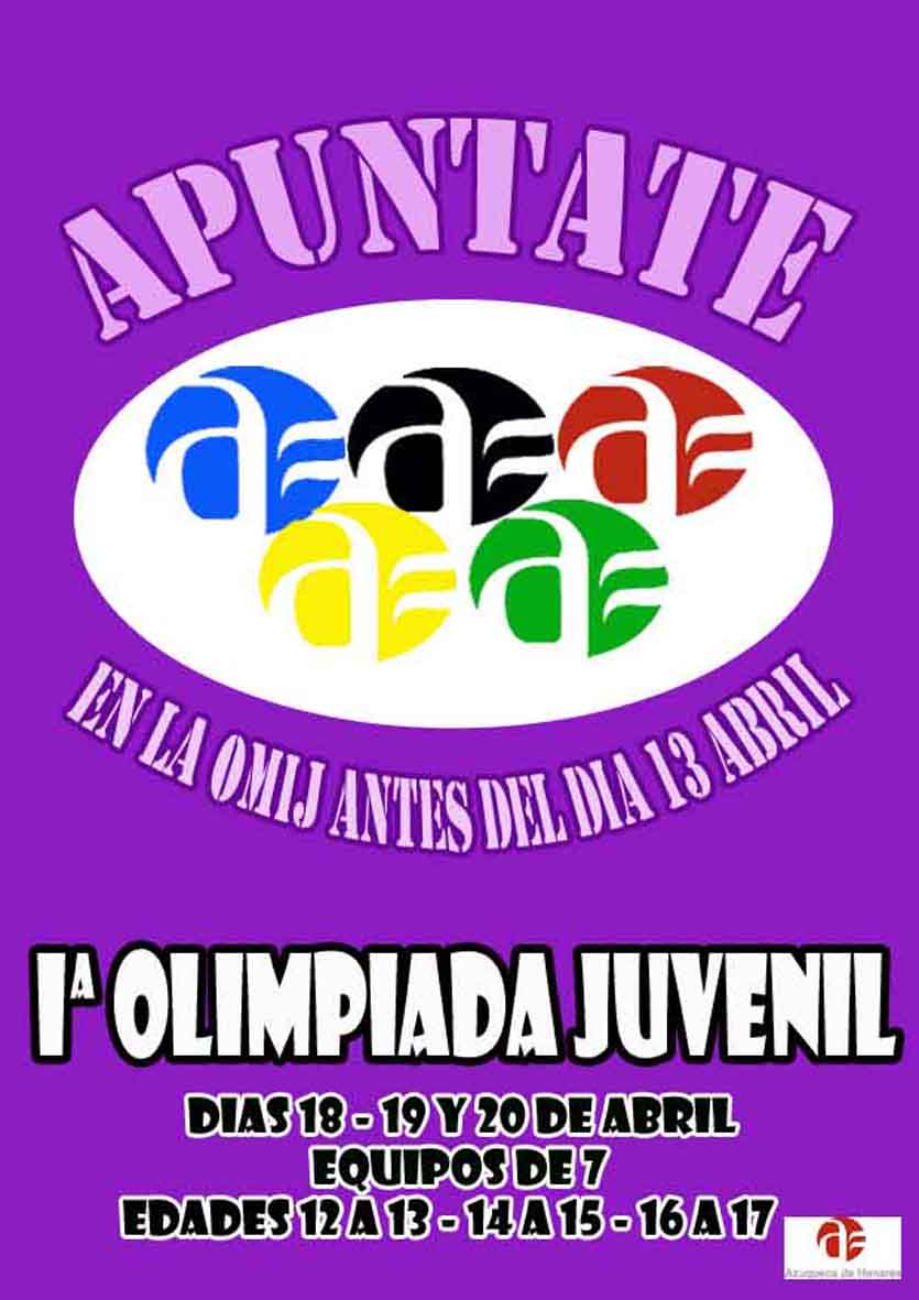 Los días 18, 19 y 20 de abril se celebrará la I Olimpiada Juvenil de Azuqueca, organizada por el Ayuntamiento, en la que podrán participar jóvenes de 12 a 17 años. La inscripciones se pueden formalizar hasta el día 13, de forma gratuita, en la Oficina Municipal de Información Juvenil (OMIJ), ubicada en El Foro. Los equipos participantes tienen que estar integrados por un mínimo de siete personas y un máximo de diez y las competiciones, de distintas disciplinas deportivas (fútbol, patinaje, baseball y trivial gigante), se desarrollarán en las instalaciones deportivas municipales.Para el transcurso de la competición, se distribuirá a los participantes en tres categorías en función de su edad: de 12 a 13 años, de 14 a 15 y de 15 a 16.CursosTambién están abiertas las inscripciones en dos cursos organizados por la concejalía de Juventud: uno de fotografía digital que comienza el jueves 7 de abril y otro de Lengua de Signos cuyo inicio está previsto para el día 27. En ambos casos, la inscripción tiene un precio de 25 euros para empadronados en Azuqueca y de 35 euros para el resto. El curso de fotografía digital, impartido por la asociación Fotoflú, tiene una duración de 30 horas y se impartirá los martes y jueves, de 20 a 22 horas, en El Foro. El de Lenguaje de Signos, impartido por la Asociación de Intérpretes de Lengua de Signos 'Signia', también durará 30 horas y se desarrollará los lunes y miércoles, de 19 a 21 horas.