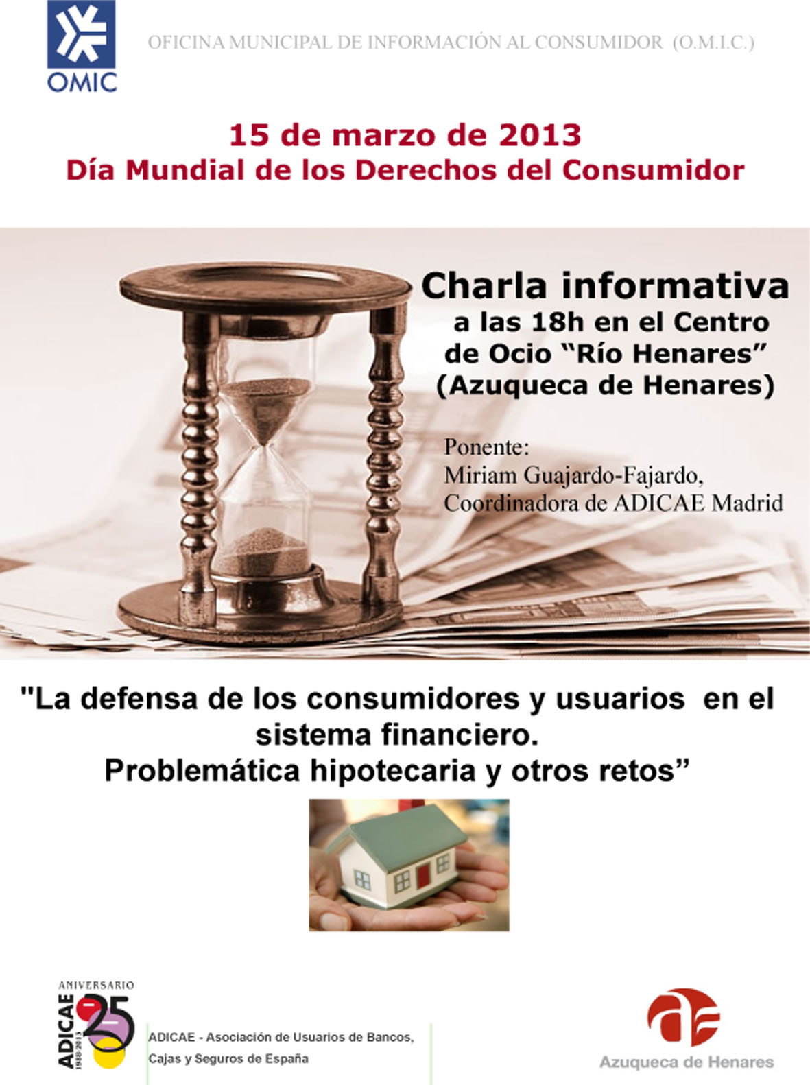 Coincidiendo con el Día Mundial de los Derechos del Consumidor, este viernes, 15 de marzo, el Ayuntamiento de Azuqueca ha organizado una charla informativa sobre hipotecas, que impartirá Miriam Guajardo-Fajardo, coordinadora de la asociación de Usuarios de Bancos, Cajas y Seguros (ADICAE). La concejala de Consumo, Elisa Cansado, ha adelantado que en la charla, titulada 'La defensa de los consumidores y usuarios en el sistema financiero; problemática hipotecaria y otros retos', "se abordarán asuntos tan importantes para las familias como las claúsulas abusivas en hipotecas o las últimas novedades sobre la dación en pago y la sentencia que hoy hemos conocido del Tribunal Europeo de Justicia sobre la ley hipotecaria española". "Queremos que la representante de ADICAE ayude a despejar muchas de las dudas que preocupan a los ciudadanos sobre estos temas tan preocupantes, especialmente en estos momentos de dificultades". La charla dará comienzo a las 18 horas, en el Centro de Ocio Río Henares. Talleres de consumo