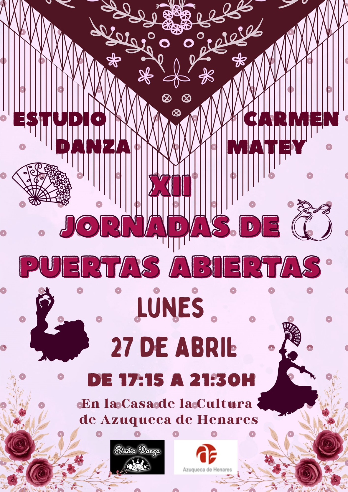Como cierre, el lunes 27 de abril, desde las 17:15 horas, Estudio Danza Carmen Matey de Azuqueca celebra en la Casa de la Cultura unas jornadas de puertas abiertas, que alcanzan la edición número 12. Durante la tarde, se sucederán exhibiciones y muestras de la técnica del mantón, toque de castañuelas, el uso del abanico o zapateado.