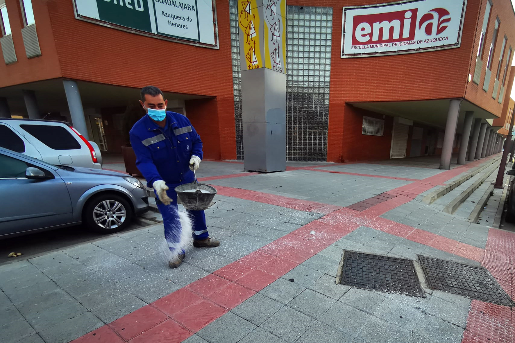 Imagen de archivo de un operario municipal esparciendo sal en el entorno del Learning Center. Fotografía: Ayuntamiento de Azuqueca