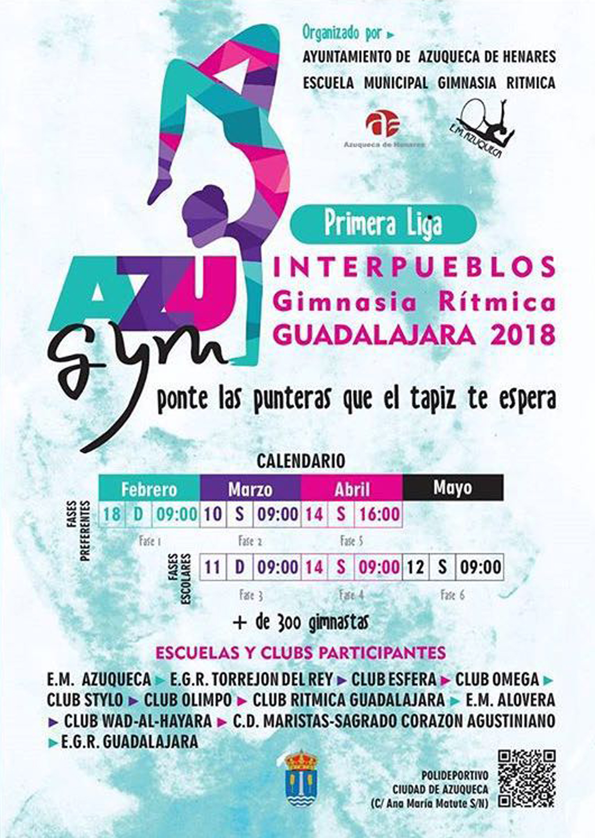 Azuqueca de Henares acoge a partir de este domingo, 18 de febrero, 'Azu Gym', la primera Liga Interpueblos de Gimnasia Rítmica de Guadalajara. "Se trata de una competición novedosa en la que está prevista la participación de más de 300 gimnastas procedentes de un total de 11 escuelas y clubes de la provincia", avanza el concejal de Deportes, Sergio de Luz, quien agradece "el compromiso, la disposición y el asesoramiento" del profesorado y alumnado de la Escuela Municipal de esta disciplina para la puesta en marcha de esta liga.Además de la Escuela Municipal de Azuqueca, se han sumado a esta liga la Escuela de Gimnasia Rítmica de Torrejón del Rey, el Club Esfera (Cabanillas del Campo), el Club Omega (Villanueva de la Torre), el Club Stylo (Alovera), el Club Rítmica de Guadalajara, la Escuela Municipal de Alovera, el Club Wad-Al-Hayara (Guadalajara), el Club Deportivo Maristas-Sagrado Cozarón Agustiniano (Guadalajara) y la Escuela de Gimnasia Rítmica de Guadalajara.Calendario de competiciónEl polideportivo Ciudad de Azuqueca es la sede esta liga, cuyo calendario contempla cuatro jornadas entre los meses de febrero y abril. En concreto, se van a celebrar seis fases: tres preferentes (domingo 18 de febrero y sábado 10 de marzo, desde las 9 horas y sábado 14 de abril, desde las 16 horas) y otras tres escolares (domingo 11 de marzo, sábado 14 de abril y sábado 12 de mayo, desde las 9 horas).