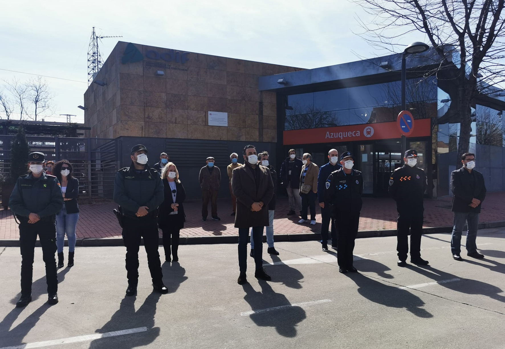 Como cada año desde 2004, este mediodía, se ha celebrado en Azuqueca de Henares el acto de recuerdo y homenaje a las víctimas de los atentados en los trenes del 11 de marzo. El alcalde, los portavoces de los grupos municipales y representantes de la Guardia Civil, de la Policía Local y de Protección Civil han guardado cinco minutos de silencio junto al monolito situado a la entrada de la estación de Renfe. Se ha depositado un centro de flores como homenaje a las víctimas. Debido a la situación sanitaria, se ha reducido la asistencia de personas a este acto.