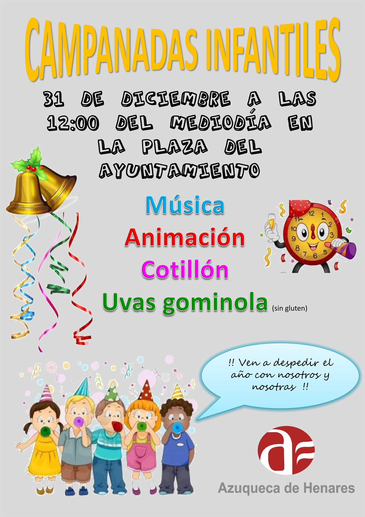 El Ayuntamiento ha organizado este año una despedida especial del año para los más pequeños, con unas 'Campanadas infantiles' en la plaza de La Constitución. Se celebrarán el último día del año, el 31 de diciembre, a las 12 del mediodía y estarán amenizadas con música, animación y uvas gominola.El Buzón Real para la recogida de las cartas de los más pequeños de Azuqueca a sus Majestades de Oriente ya está instalado en la Casa de la Cultura. Permanecerá allí hasta el día 4 de enero y entre las cartas depositadas (como máximo de 14,8x21 centímetros -A5-), se sortearán los regalos en la fiesta del polideportivo de La Paz que se celebrará al término de la Cabalgata del 5 de enero. "Solo se admite una carta por niño o niña y las que superen las medidas establecidas serán retiradas", advierte la concejala de Fiestas, Charo Martín, que destaca "la especial intensidad con que viven los más pequeños estas fiestas navideñas".Este miércoles se han puesto a la venta en los cajeros ciudadanos los vales para la chocolatada con churros que se celebrará el día 5 de enero, desde las 17 horas, en la plaza del polideportivo La Paz. Los vales tienen un precio de 1 euro y se podrán adquirir en los cajeros hasta el día 4.Pista de hieloContinúan además estos días las actividades de la Plaza Navideña y de la pista de hielo, en la que ya han patinado más de 4.000 personas. Está abierta de lunes a jueves, de 9:30 a 14:30 y de 17:30 a 21:30 horas; los viernes, de 9:30 a 14:30 y de 16:30 a 23 horas, y los sábados, domingos y festivos, de 11 a 23 horas (excepto los domingos 24 y 31 de diciembre, que abrirá de 11 a 14 horas, y los lunes 25 de diciembre y 1 de enero, de 12 a 22 horas). La entrada general cuesta 5 euros y la reducida, 3 euros, que se aplica al alumnado de colegios e institutos, de los talleres municipales de Cultura y Juventud y de las Escuelas Municipales Deportivas, así como a las familias numerosas. Los establecimientos adheridos a ACEPA están distribuyendo entre sus clientes vales descuento de 2 euros por cada compra superior a 15 euros. Se pueden adquirir también bonos para diez accesos a la pista por 40 euros.