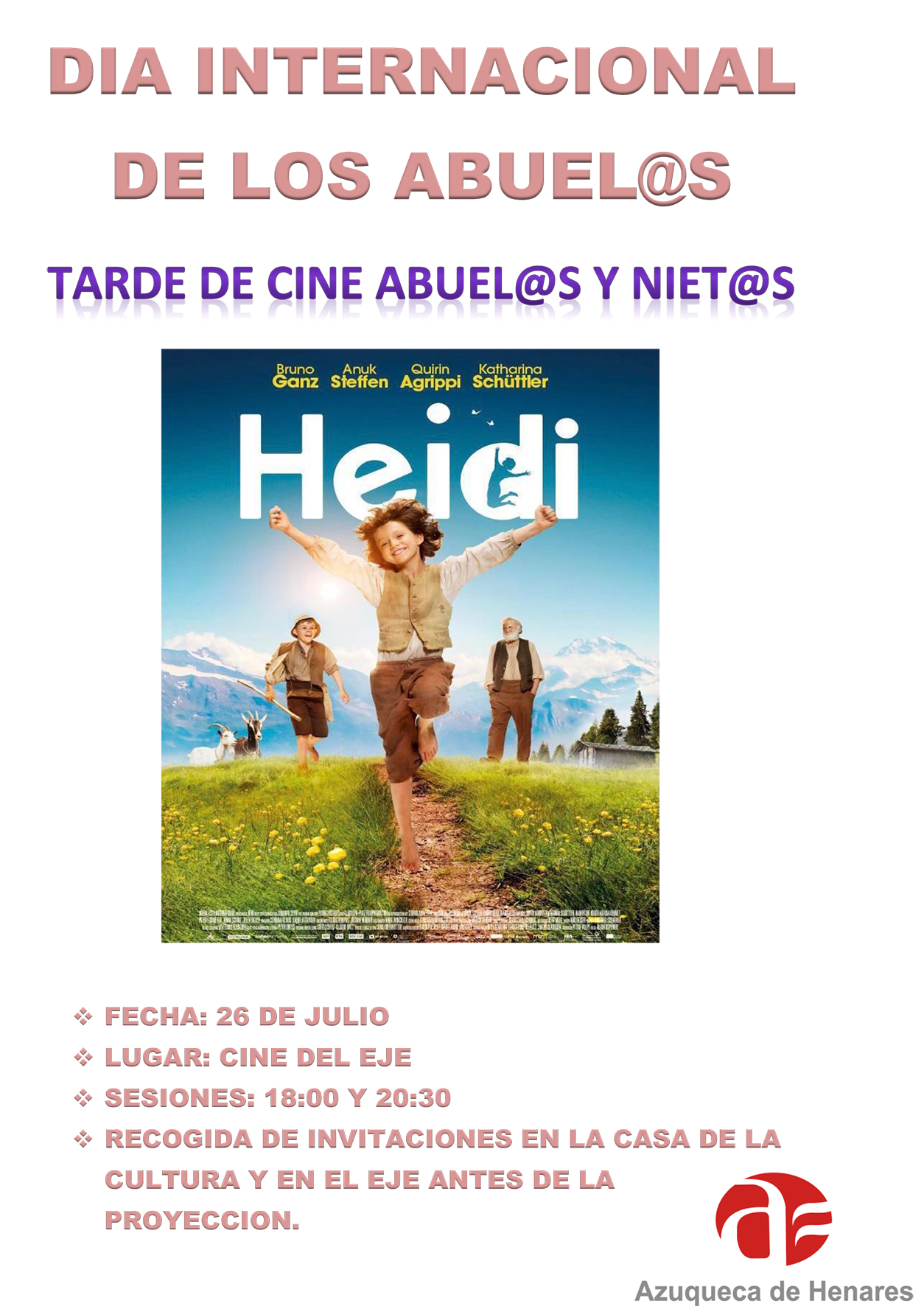 El Ayuntamiento de Azuqueca de Henares ha organizado la proyección de la película 'Heidi' en la Casa de la Cutura, el próximo lunes, día 26 de julio, para conmemorar el Día Internacional de las Abuelas y los Abuelos. La concejala de Igualdad de Oportunidades, Piedad Agudo, explica que "se trata de una propuesta lúdica de convivencia intergeneracional con la que se pretende propiciar que las personas mayores pasen un rato de ocio acompañados de sus nietas o nietos, viendo esta película tan clásica y protagonizada además por un abuelo y su nieta".La edil destaca el papel "de apoyo en la conciliación familiar que realizan las abuelas y los abuelos, cuidando a sus nietas y nietos". "Por eso, hemos programado con motivo de esta fecha esta actividad, gratuita, para que todas y todas pasen un buen rato, disfrutando del cine", insiste Agudo, que destaca además que "durante mucho tiempo, debido a la pandemia de COVID-19, los contactos de las personas mayores estuvieron muy limitados, las abuelas y abuelos no podían ver a sus nietas y nietos, y ahora, con todas las precauciones, es el momento de ir recuperando esos encuentros tan deseados".Las invitaciones para asistir a la proyección de 'Heidi' se pueden recoger ya en la conserjería de la Casa de la Cultura. Se han programado dos pases: uno a las 18 horas y otro a las 20:30 h. Entre las dos sesiones, se procederá a la limpieza y desinfección de la sala y en todo momento se seguirá el protocolo para evitar contagios de COVID-19.