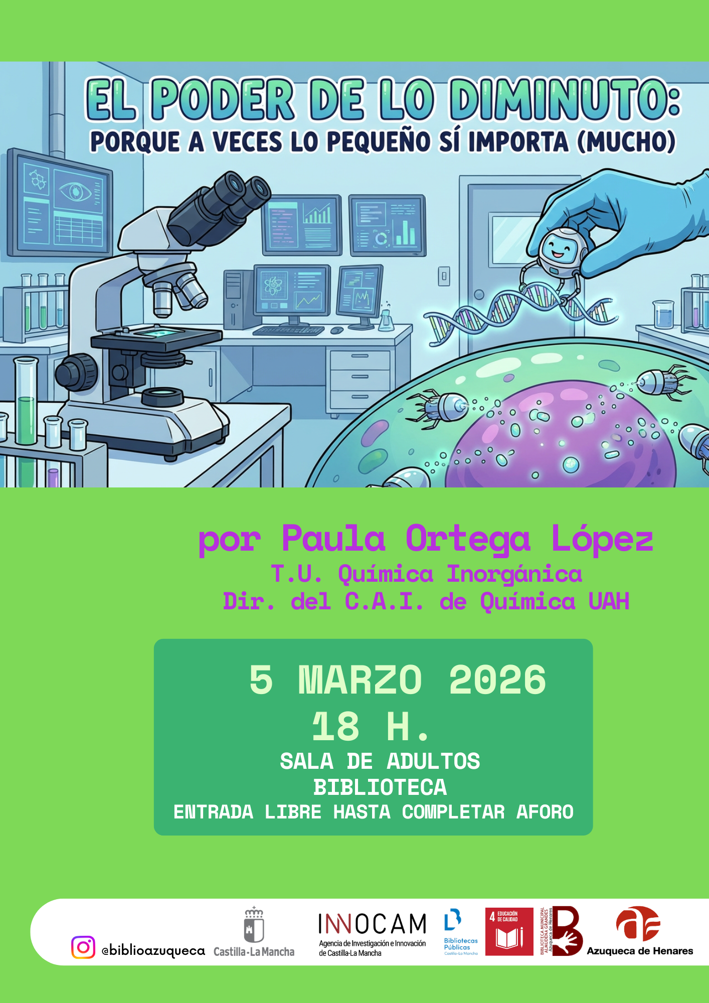 La Biblioteca Pública Municipal de Azuqueca de Henares y la Agencia de Investigación e Innovación de Castilla-La Mancha (INNOCAM) organizan esta charla conferencia impartida por la Doctora Paula Ortega López (T.U Química Inorgánica y Directora del CAI de Química de UAH), investigadora principal del Proyecto nanocosmetics.