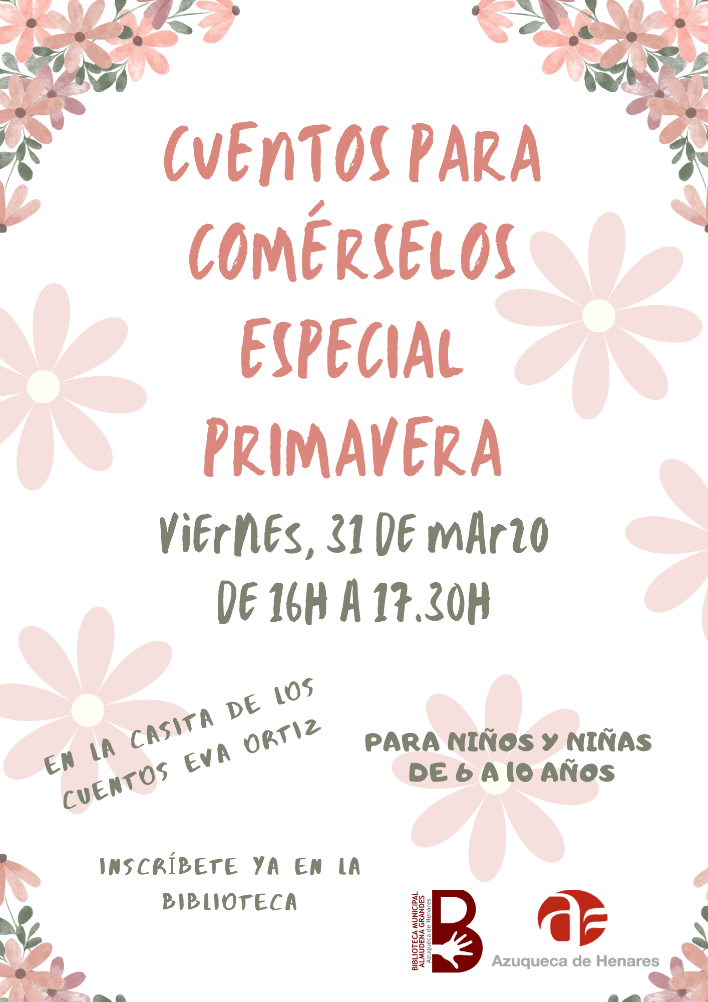 Con motivo de la llegada de la primavera en la biblioteca vamos a realizar un taller especial de "Cuentos para comérselos" dirigido a niños y niñas de 6 a 10 años . El Taller se realizará en la Casita de los Cuentos Eva Ortiz el viernes 31 de marzo de 16.00 a 17.30 h.