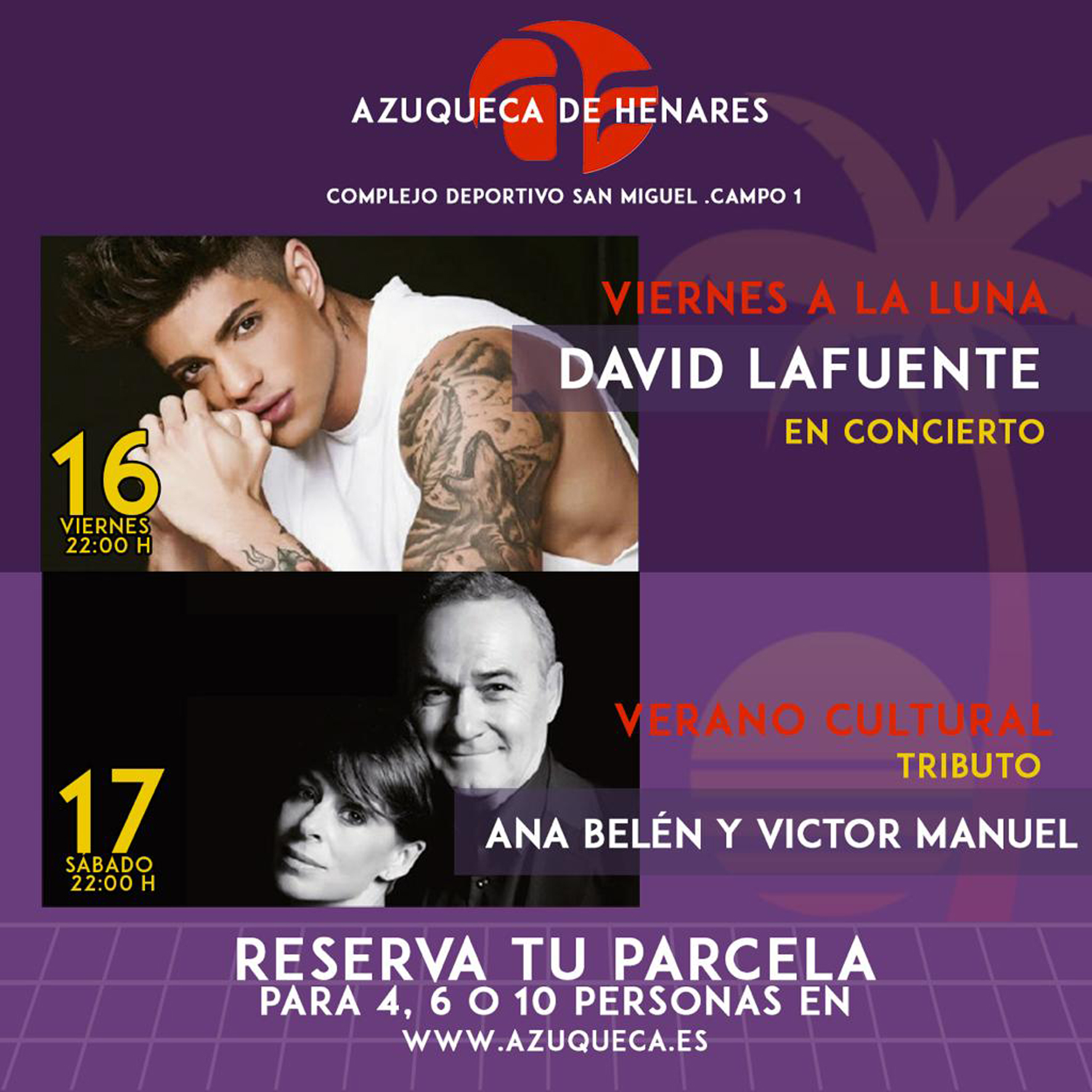 Los dos programas de ocio cultural veraniego del Ayuntamiento de Azuqueca de Henares, 'Viernes a la luna' y 'Azuqueca Verano Cultural', continúan este fin de semana. Para el viernes, se ha programado una actuación de David Lafuente y el sábado será el turno del tributo a Ana Belén y Víctor Manuel. Los dos espectáculos se desarrollarán en el campo 1 de fútbol del complejo San Miguel y comenzarán a las 22 horas. Las entradas se pueden adquirir en los cajeros ciudadanos o a través de esta página web (pinche AQUÍ).