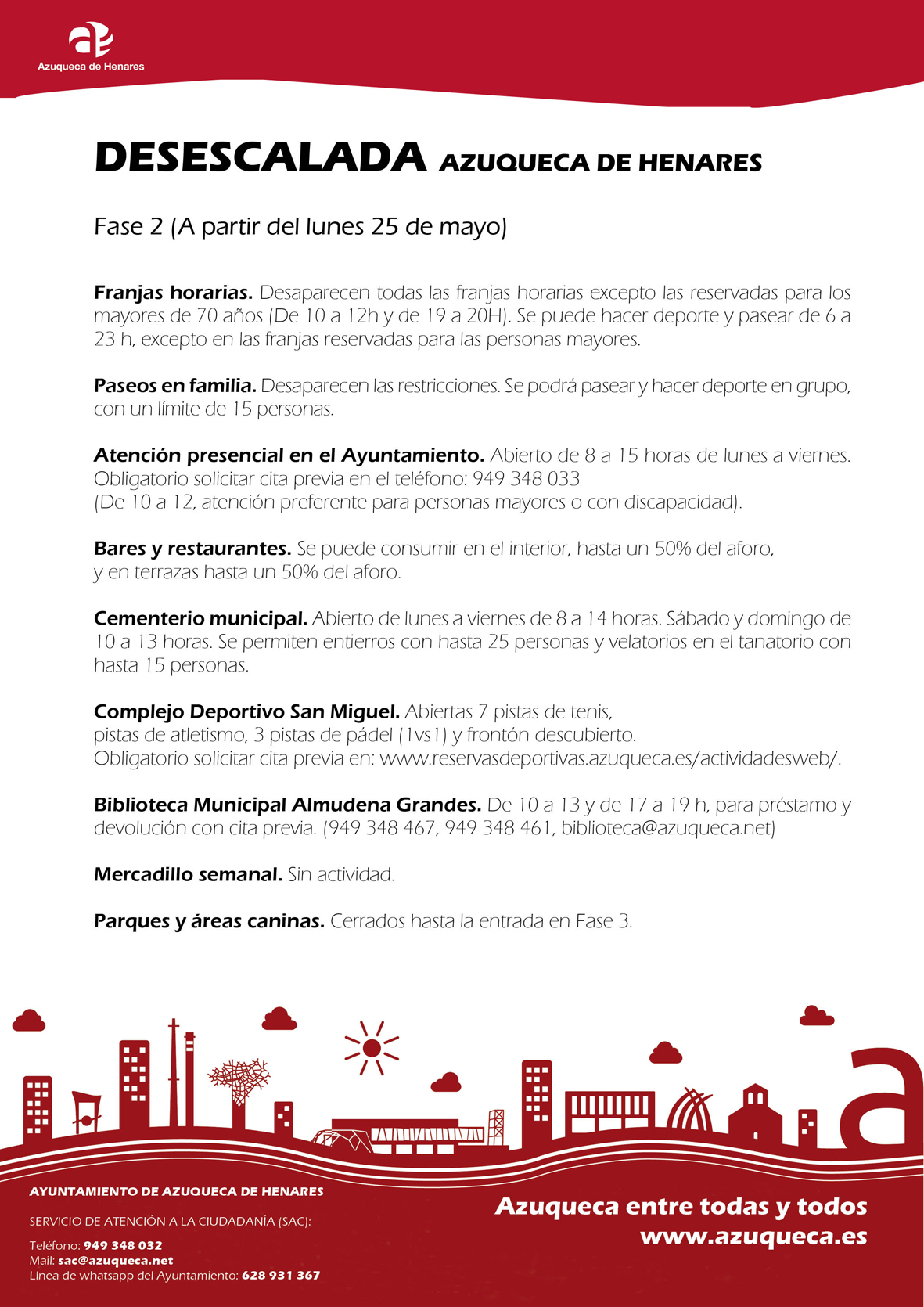 Azuqueca de Henares, al igual que el resto de la provincia de Guadalajara, pasará este lunes, 25 de mayo, a la Fase 2 o Intermedia contemplada en el Plan de Desescalada o para la Transición hacia una Nueva Normalidad diseñado por el Gobierno de España con el objetivo de conseguir la adaptación del conjunto de la sociedad tras la crisis provocada por la COVID-19. Conviene recordar que, desde el jueves 21 de mayo, es obligatorio el uso de mascarillas en espacios públicos por parte de la población adulta y de menores de 6 años -se recomienda a partir de los 3 años-.Entre las novedades para esta nueva fase, destaca la desaparición de las franjas horarias, solo se mantiene la reservada para personas mayores de 70 años, de 10 a 12 y de 19 a 20 horas. También desaparecen las restricciones para el paseo con los menores. Desde mañana se puede pasear en familia. Tanto pasear como hacer deporte se podrá hacer en grupo, con un límite de 15 personas.Según establece el plan nacional, en la Fase 2 o intermedia pueden abrir los comercios de más de 400 metros cuadrados y, en el caso de la restauración, se permite acceder al interior de los locales -hasta ahora, solo se permitía el uso de terrazas- con una ocupación máxima de un 50 por ciento del aforo, con garantías de separación y solamente para el servicio de mesas.Medidas en AzuquecaEn el caso de Azuqueca, con el fin de garantizar la seguridad de la ciudadanía y evitar riesgos de propagación y contagio de la COVID-19, los parques  de El Norte, La Quebradilla, Los Almendros y El Arboreto, junto con las áreas caninas, van a continuar cerrados. También se retrasa la celebración del mercado semanal de los miércoles, que durante la Fase 2 seguirá en suspensión. Tampoco van a abrir el cine, la bolera y la cafetería del Espacio Joven Europeo (EJE).En cuanto al cementerio municipal, se amplía el horario de apertura con los fines de semana. De este modo, se puede visitar de lunes a viernes, de 8 a 14 horas, con limitaciones de aforo y aseos cerrados, y sábados y domingos, de 10 a 13 horas.Las medidas ya aplicadas en la Fase 1 se mantienen. De este modo, funciona el transporte urbano de viajeros con las dos líneas que recorren el municipio y en horario de 6 a 22 horas. En Deportes, dentro del horario de 8 a 14 y de 16 a 21 horas, se pueden reservar pistas en el Complejo Deportivo San Miguel para la práctica del tenis, el atletismo y el tiro con arco en el sitio web municipal
