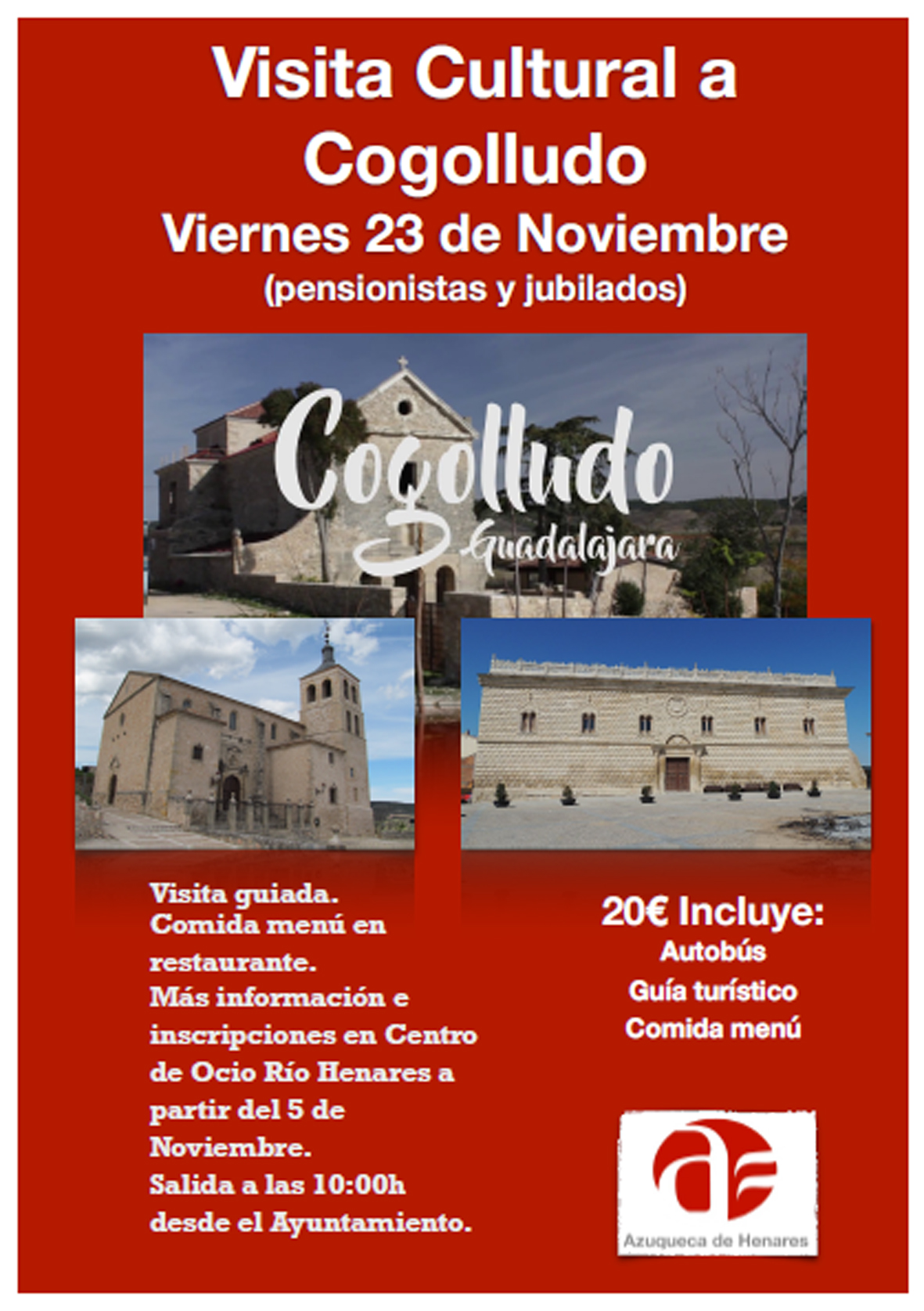 Dentro de la programación municipal de actividades de ocio dirigidas a personas mayores, el Ayuntamiento de Azuqueca de Henares organiza el viernes 23 de noviembre una visita cultural a Cogolludo. El precio es de 20 euros e incluye traslado en autobús, guía turístico y comida de menú. La inscripción se puede tramitar en la conserjería del Centro de Ocio Río Henares. La salida se ha fijado a las 10 horas del viernes 23 desde la plaza de La Constitución."Nuestros mayores son un colectivo muy activo y dinámico y, desde el Ayuntamiento, tratamos de dar respuesta a sus inquietudes y necesidades con la organización de distintas propuestas como esta salida a Cogolludo", explica la concejala de Promoción de los Mayores, Rufi Fernández. En este sentido, la edil detalla que este viernes 16, se imparte en el Centro de Ocio una sesión de relajación guiada y el viernes 30, un taller del manejo del teléfono móvil (es imprescindible asistir con móvil propio). En ambos casos, las actividades son gratuitas y comienzan a las 10 horas en el Centro de Ocio, donde se puede tramitar la participación.Además, el Ayuntamiento ha lanzado este curso un grupo de conversación donde los participantes compartir sus preocupaciones y vivencias para combatir la soledad. Las reuniones se celebran cada miércoles, a las 17 horas.