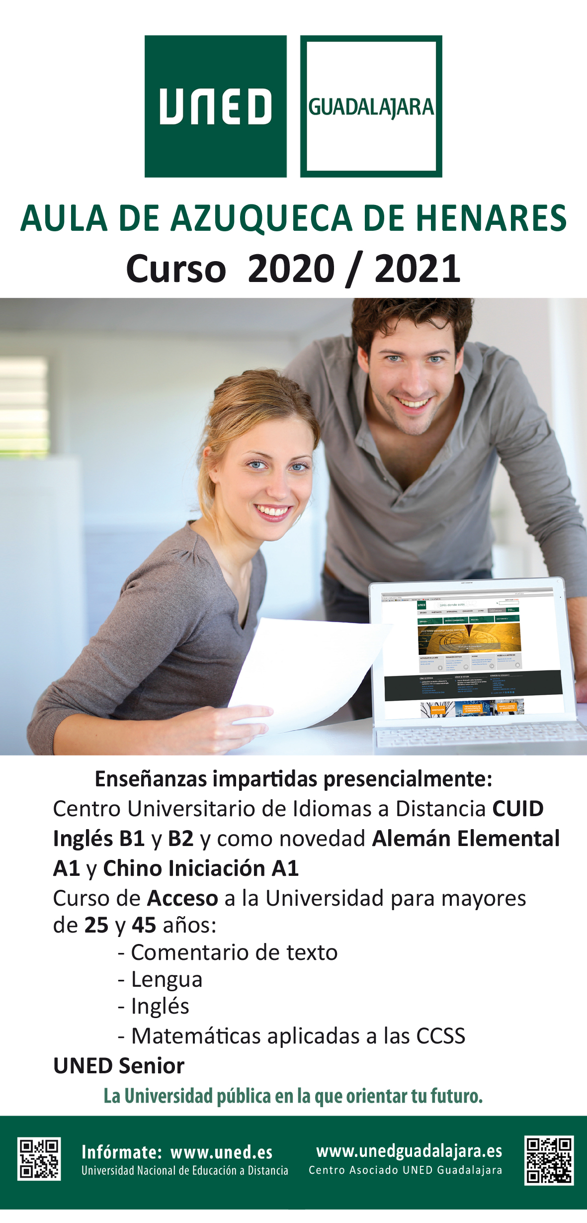 El Aula de la UNED en Azuqueca de Henares amplía su oferta educativa de cara al curso 2020/2021 con la incorporación de clases de alemán elemental (A1) y chino en nivel iniciación (A1). Estos cursos se suman a la enseñanza de Inglés  (B1 y B2), que se vienen impartiendo a través del Centro Universitario de Idiomas a Distancia (CUID).Se mantiene además el programa UNED Senior y el curso de Acceso a la Universidad para mayores de 25 y de 45 años, con clases de Comentario de texto, Lengua, Inglés y Matemáticas Aplicadas a las Ciencias Sociales.El plazo de admisión y matrícula en los Estudios Oficiales (Grados y Microgrados), así como en el CUID y en el Acceso de mayores de 25 y 45 está abierto hasta el día 22 de octubre; en el caso de la oferta de Formación Permanente de la UNED, el plazo termina el 30 de noviembre.Los interesados pueden obtener más información en la página web del Centro Asociado de la UNED en Guadalajara, www.unedguadalajara.es, en la del aula de Azuqueca, www.uned.es. El Aula de la UNED en Azuqueca se puso en marcha hace tres cursos y tiene su sede física en el edificio municipal educativo de El Foro. De manera añadida a la oferta académica, la UNED ha ofrecido desde su llegada a Azuqueca actividades culturales no regladas abiertas a la población en general. La más reciente ha sido una propuesta dirigida por el prestigioso psicólogo Javier Urra, que se celebró vía telemática el pasado mes de julio.