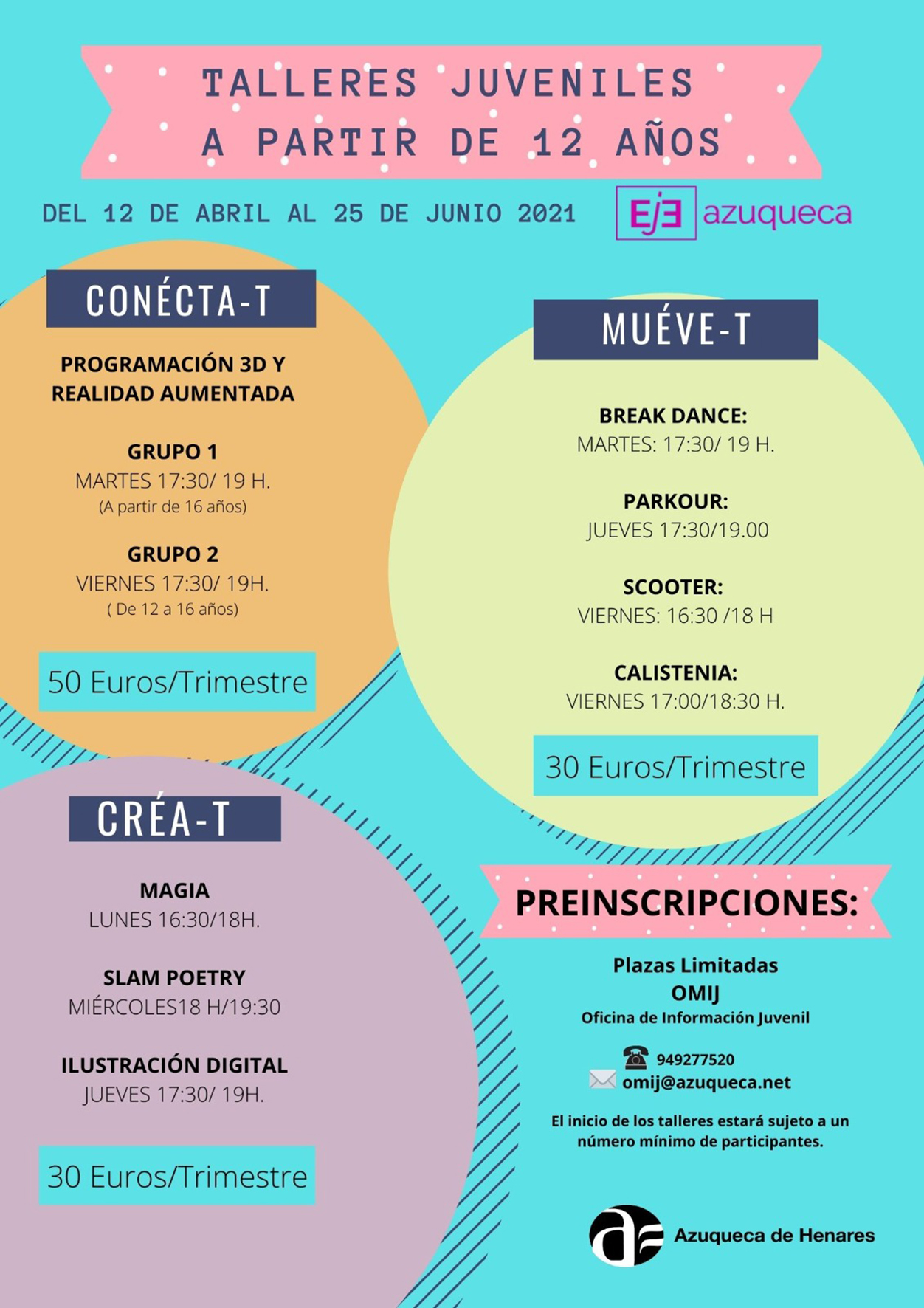 De cara al nuevo trimestre, el Ayuntamiento de Azuqueca de Henares, desde el área de Juventud, ha puesto en marcha una programación de talleres divididos en tres bloques: 'Conécta-T', 'Créa-T' y 'Muéve-T'. El plazo de preinscripción está ya abierto, las plazas están limitadas y el desarrollo de los talleres está condicionado a que se alcance un número mínimo de inscripciones. Las actividades, dirigidas a mayores de 12 años, comenzarán el 12 de abril y se prolongarán hasta el 25 de junio y se desarrollarán en el Espacio Joven Europeo (EJE) de Azuqueca.'Muéve-T' ofrece talleres de Break Dance, Parkour, Scooter y Calistenia. El precio es de 30 euros por trimestre.A través de 'Créa-T', se han programado talleres de Ilustración digital, Magia y Slam Poetry. El precio es también de 30 euros por trimestre.Por último, 'Conécta-T' plantea un curso de 'Programación 3D y realidad aumentada'. La tarifa en este caso es de 50 euros al trimestre.Las personas interesadas pueden formalizar su preinscripción y obtener más información en la Oficina Municipal de Información Juvenil (OMIJ): teléfono 949 27 75 20 y correo electrónico
