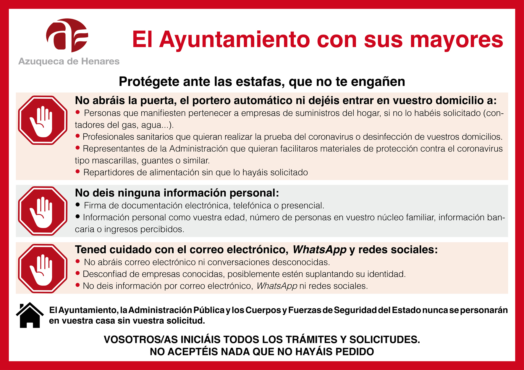 Con el objetivo de "evitar que las personas mayores, especialmente aquellas que viven solas, sufran algún tipo de engaño o estafa", el Ayuntamiento de Azuqueca de Henares, a propuesta del grupo municipal del Partido Popular, ha elaborado una serie de consejos para sensibilizar a este colectivo. "Desgraciadamente, durante el periodo de confinamiento declarado por el Gobierno de España, se están detectando casos en los que el COVID-19 se utiliza de excusa para acceder a los hogares o acercarse a nuestros mayores para fines delictivos", explica el concejal de Buen Gobierno, Álvaro Cuevas, quien agradece la colaboración de la portavoz del PP, Aure Hormaechea, en la redacción de estas recomendaciones."Debe quedar claro que ni el Ayuntamiento ni cualquier otra administración pública, ni tampoco los Cuerpos y Fuerzas de Seguridad del Estado, se personan en una vivienda sin una solicitud previa", señala el edil, quien insiste en que "no se debe aceptar ningún servicio ni prestación que previamente no se haya solicitado o tramitado".En este sentido, el documento elaborado recoge algunas situaciones concretas en las que no debe abrirse la puerta, salvo que se haya contactado antes, a personas que manifiesten pertenecer a empresas de suministros -agua, gas, luz, telefonía-, que se presenten como sanitarios que acuden a realizar la prueba del COVID19 o a desinfectar la vivienda, que se identifican como representantes de la administración que van a facilitar material de protección -mascarillas, guantes, gel- o repartidores de alimentación.También se recomienda no facilitar información personal -edad, personas del núcleo familiar, datos bancarios o ingresos- ni firmar documentos, ya sea de manera electrónica, telefónica o presencial. Por último, se aconseja tener cuidado con los mensajes que se reciben en el correo electrónico, 'WhatsApp' y redes sociales si proceden de personas desconocidas. Además, se recuerda que, en caso de empresas conocidas, se puede suplantar su identidad, por lo que conviene contrastar y confirmar la información por otros medios.Desde el Ayuntamiento, "se están estudiando fórmulas para hacer llegar a estas recomendaciones a los mayores", indica el concejal de Buen Gobierno, quien solicita "la colaboración de familiares y vecinos para que difundan los consejos y les sensibilicen sobre este asunto". Álvaro Cuevas también apunta que "tanto Guardia Civil, como Policía Local están extremando las precauciones hacia este colectivo".