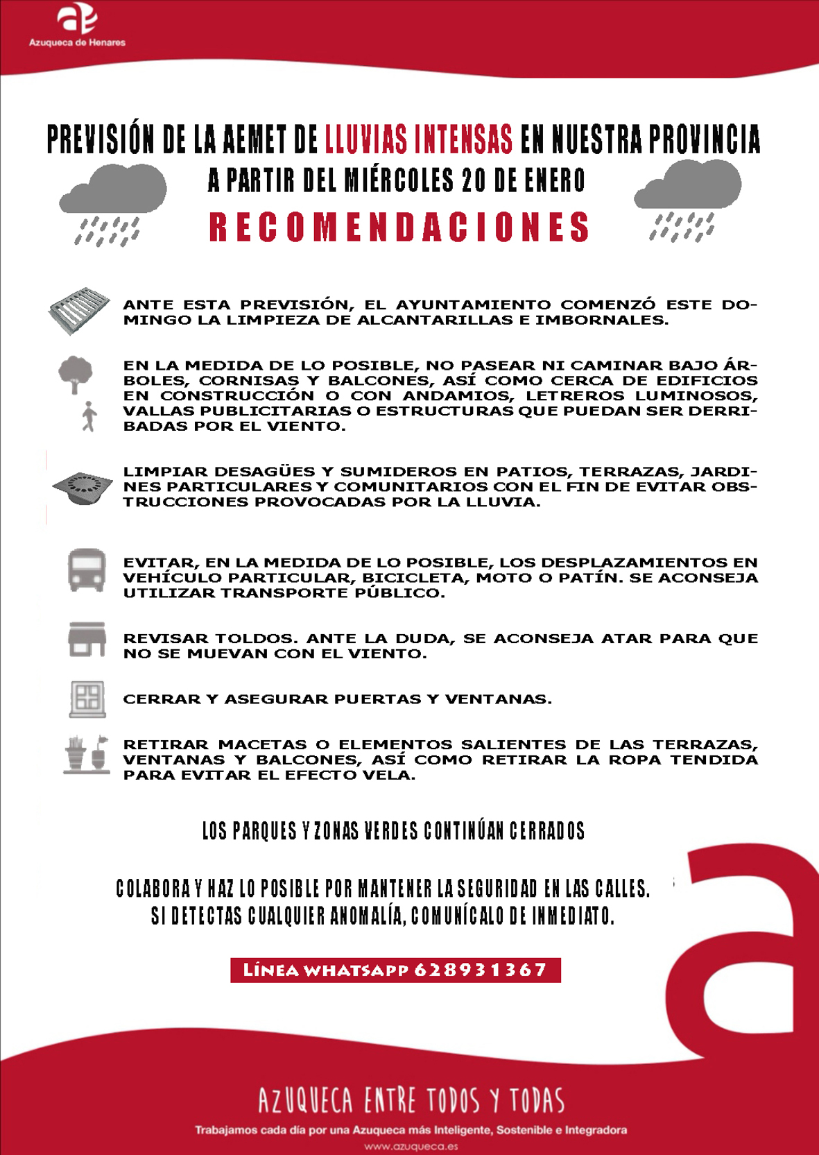 Ante la previsión de vientos y fuertes lluvias emitida por la Agencia Estatal de Meteorología (AEMET) a partir del miércoles, 20 de enero, y durante el resto de semana, el Ayuntamiento de Azuqueca de Henares ha puesto en marcha un operativo especial de limpieza de imbornales. "Con la lluvia, se va a acelerar el proceso de deshielo y se pueden producir inundaciones", explica el concejal de Ciudad Sostenible, Antonio Expósito.Para evitar complicaciones con el agua, el Ayuntamiento ha reforzado la plantilla municipal con la contratación de tres empresas para la retirada de nieve y hielo de las aceras y poder despejar el mayor número de imbornales antes del inicio de la lluvia. "Estamos comenzando en las zonas más sensibles de la ciudad, es decir, aquellas con antecedentes por inundaciones", apunta.Los trabajos de limpieza en alcantarillado e imbornales se completan con otras medidas preventivas. "Además de la revisión y control de cauces, se está procediendo a la eliminación de elementos de riesgo en arbolados y cornisas", indica.Este nuevo dispositivo refuerza el plan especial de nieve que el Ayuntamiento activó el viernes 8 de enero. "Con el objetivo de recuperar la normalidad en las calles de la ciudad cuanto antes, se ha trabajado sin descanso, por turnos, con un equipo de 68 operarios municipales, 8 máquinas y la distribución de 90.000 kilos de sal", repasa el edil azudense. Además, durante el pasado fin de semana, 23 militares de la Brigada Extremadura XI del Ejército de Tierra colaboraron en la retirada de nieve y hielo.Recomendaciones ante las lluvias intensasEl Ayuntamiento azudense también está difundiendo una serie de recomendaciones ante las próximas lluvias intensas. Se aconseja, en la medida de lo posible, no caminar ni pasear bajo árboles, cornisas y balcones, así como cerca de edificios en construcción o con andamios, letreros luminosos, vallas publicitarias o estructuras que puedan ser derribadas por el viento. Precisamente, los parques y zonas verdes siguen cerrados.También se recomienda a la ciudadanía la limpieza de desagües y sumideros en patios, terrazas y jardines particulares o comunitarios. Conviene evitar los desplazamientos en vehículo privado, bicicleta, moto o patín y optar por el transporte público. Hay que revisar toldos y, si es necesario, atarlos para que no se muevan con el viento. También es importante cerrar y asegurar puertas y ventanas, además de retirar macetas o elementos salientes de las terrazas, ventanas y balcones y descolgar la ropa tendida para evitar el efecto vela.