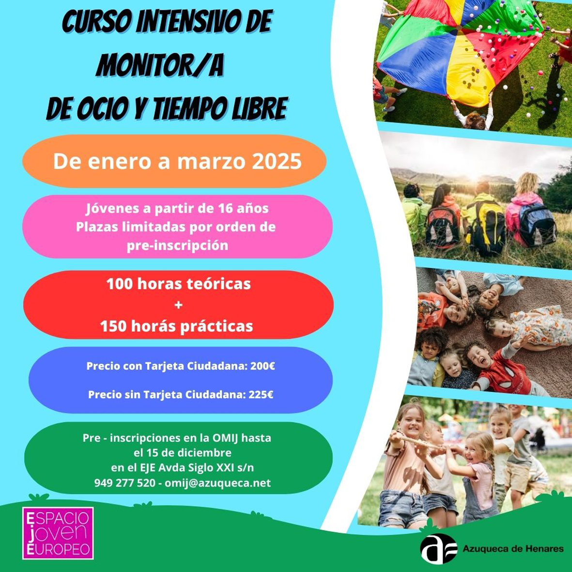 Ya se ha abierto el plazo de preinscripción en el curso intensivo de monitor de ocio y tiempo libre que ha programado el Ayuntamiento de Azuqueca de Henares para el primer trimestre del próximo año 2025. Esta acción formativa se dirige a jóvenes mayores de 16 años y “como con el curso de socorrista acuático previsto para diciembre (más información, pinchando AQUÍ), se pretende mejorar la empleabilidad de las y los jóvenes de cara a la búsqueda de un puesto de trabajo para los meses de verano”, señala el concejal del área, Enrique Pérez de la Cruz.