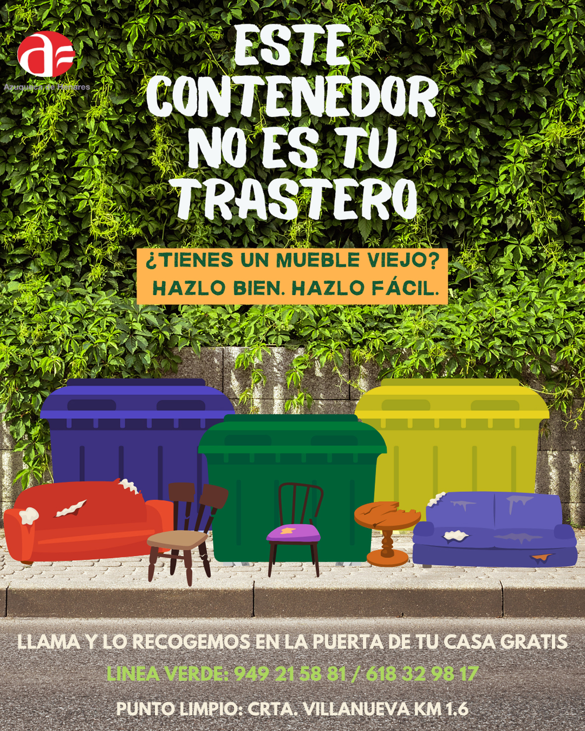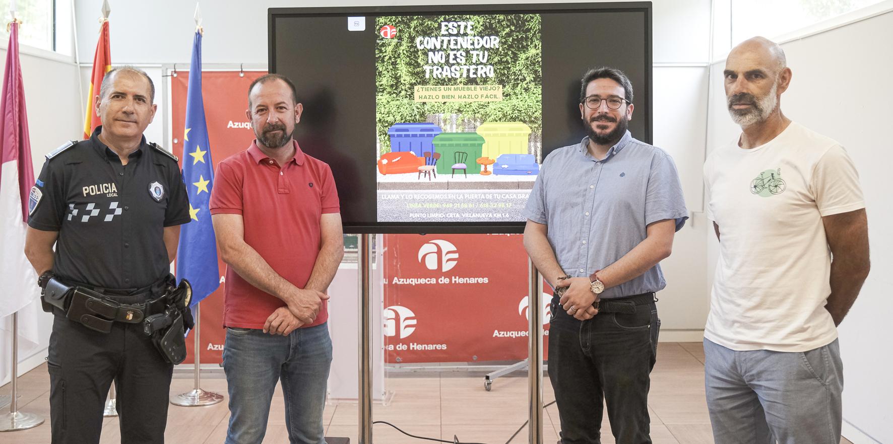 Bajo el lema “Este contenedor no es tu trastero”, el Ayuntamiento de Azuqueca de Henares ha puesto en marcha una nueva campaña de concienciación para “fomentar la correcta gestión de los residuos y, sobre todo, recordar la importancia de depositar adecuadamente los muebles viejos y enseres voluminosos”, según ha explicado el alcalde, Miguel Óscar Aparicio, este jueves, 12 de junio, durante la presentación en el Centro de Ocio Río Henares de la campaña.
