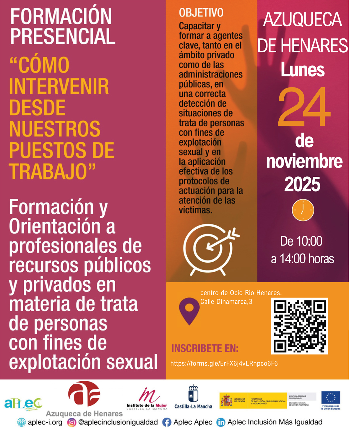Ya el lunes 24, de 10 a 14 horas, el Centro de Ocio Río Henares acoge la formación “Cómo prevenir desde nuestros puestos de trabajo”. “Es una sesión presencial dirigida a profesionales de, por ejemplo, Policía Local, ayuntamientos, Centros de Salud o Protección Civil, y en la que se abordará la trata de personas con fines de explotación sexual”, apunta Piedad Agudo. El objetivo es “capacitar y formar a agentes para la correcta detección de estos casos y la aplicación efectiva de protocolos de actuación para la atención a las víctimas”, añade. La inscripción es gratuita y se puede tramitar pinchando AQUÍ.