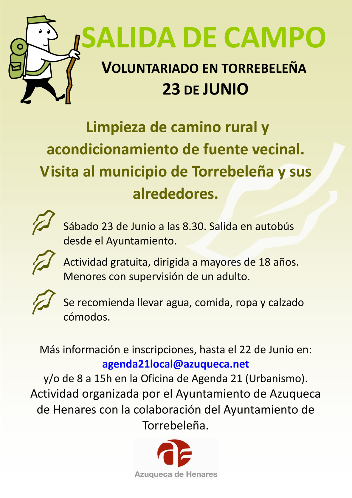 El sábado 23 de junio, el Ayuntamiento de Azuqueca de Henares organiza una nueva actividad de voluntariado ambiental en el marco del programa municipal Salidas de Campo. "En esta ocasión, la jornada se va a desarrollar en la localidad de Torrebeleña, donde, por la mañana, se va a trabajar en la limpieza de un camino rural y el acondicionamiento de una fuente y, por la tarde, se visitará la zona", avanza el concejal de Desarrollo Sostenible, Juan Pablo Román, quien recuerda que la participación es gratuita.Las personas interesadas pueden inscribirse en la oficina de Agenda 21, ubicada en el edificio de Urbanismo del parque de La Constitución (de lunes a viernes, de 8 a 15 horas), o bien, escribiendo un correo electrónico a la dirección