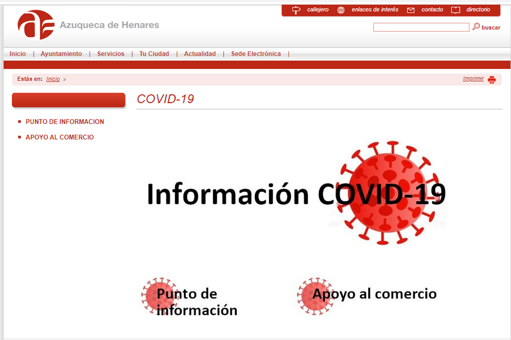 Ya está disponible en la página web municipal del Ayuntamiento de Azuqueca de Henares el denominado portal COVID-19 (pinche AQUÍ para acceder). Se trata de una nueva herramienta con la que se pretende mejorar la información a la ciudadanía, al tiempo que se apoya a las pymes y autónomos de la ciudad. Este portal se incluye dentro del paquete de medidas consensuadas con todos los grupos políticos que forman parte de la Mesa de Trabajo para la adopción de medidas contra los efectos de la crisis de la COVID19.
