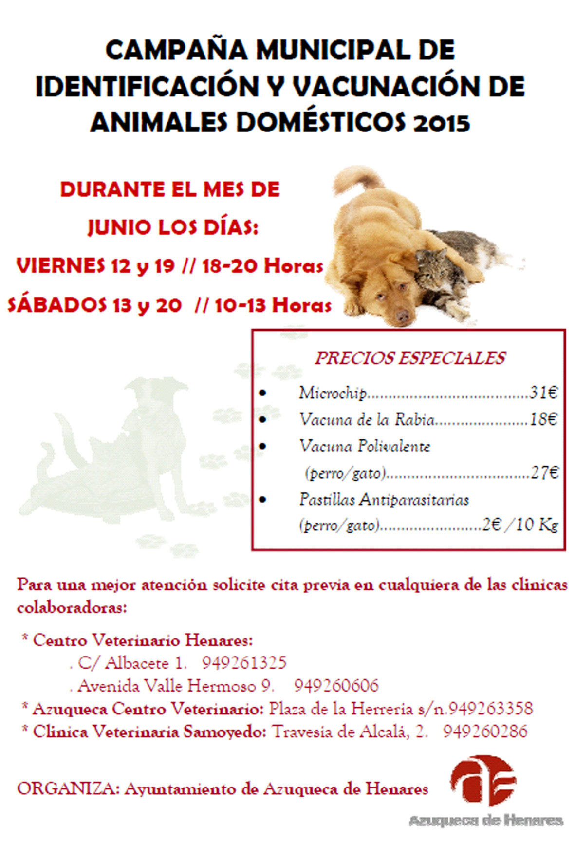 Este viernes, 12 de junio, comienza la campaña del Ayuntamiento de Azuqueca de Henares para la identificación y vacunación de animales domésticos. "Se han habilitado cuatro jornadas para que los propietarios de mascotas puedan cumplir con la normativa regional en esta materia y en la que se establece que los animales deben estar debidamente identificados mediante chip, además de estar al día en la vacuna contra la rabia, que ahora debe administrarse con carácter anual, la vacuna polivalente y los tratamientos contra los parásitos", explica la concejala de Protección de la Salud en funciones, Elisa Cansado.La campaña se va a desarrollar los viernes día 12 y 19 de junio, por las tardes, de 18 a 20 horas, y los sábados 13 y 20 de junio, por las mañanas, de 10 a 13 horas. Los precios establecidos son 31 euros, para la colocación de microchip; 18 euros, la vacuna contra la rabia; 27 euros, la vacuna polivalente y 2 euros por cada 10 kilos de peso del animal, para las pastillas antiparasitarias.Las personas interesadas deben pedir cita previa en las siguientes clínicas colaboradoras:- Centro Veterinario Henares: calle Albacete, 1 (949 26 13 25) y avenida de Vallehermoso, 9 (949 26 06 06).